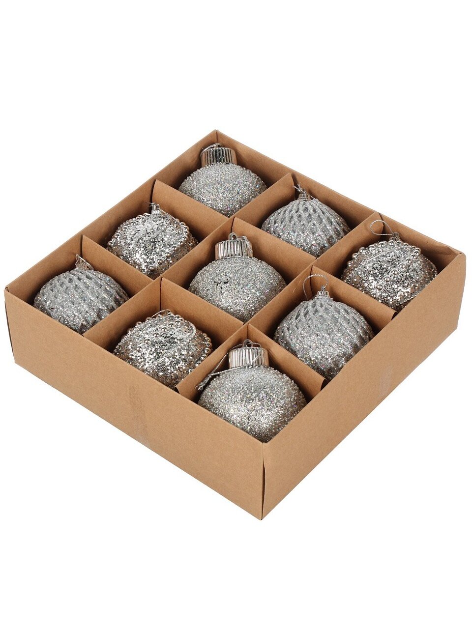 В наборе 9 серебристых шаров, каждый диаметром 8 см. Все шары однотонные, в коробке, с подвесным креплением.