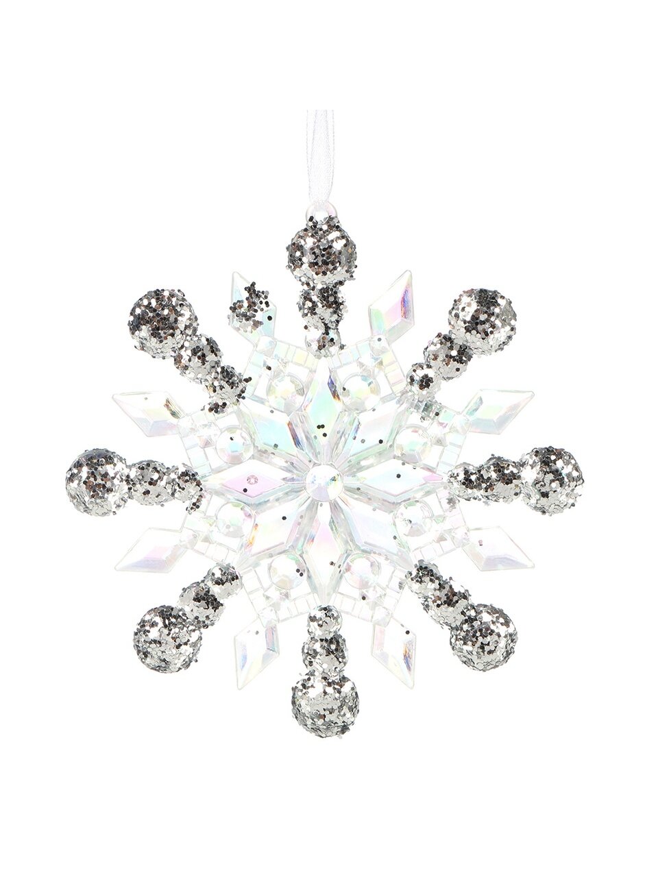 Елочное украшение «Снежинка» 12 см: стильный прозрачный пластик с серебром, небьющийся декор для дома и улицы. Легко выбрать, просто повесить.
