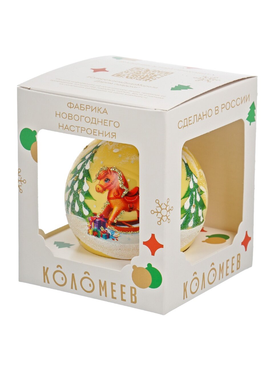 Да, шар поставляется в индивидуальной коробке, имеет эксклюзивную ручную роспись и символизирует год Лошади — отличный вариант для подарка на Новый год или корпоративное мероприятие.