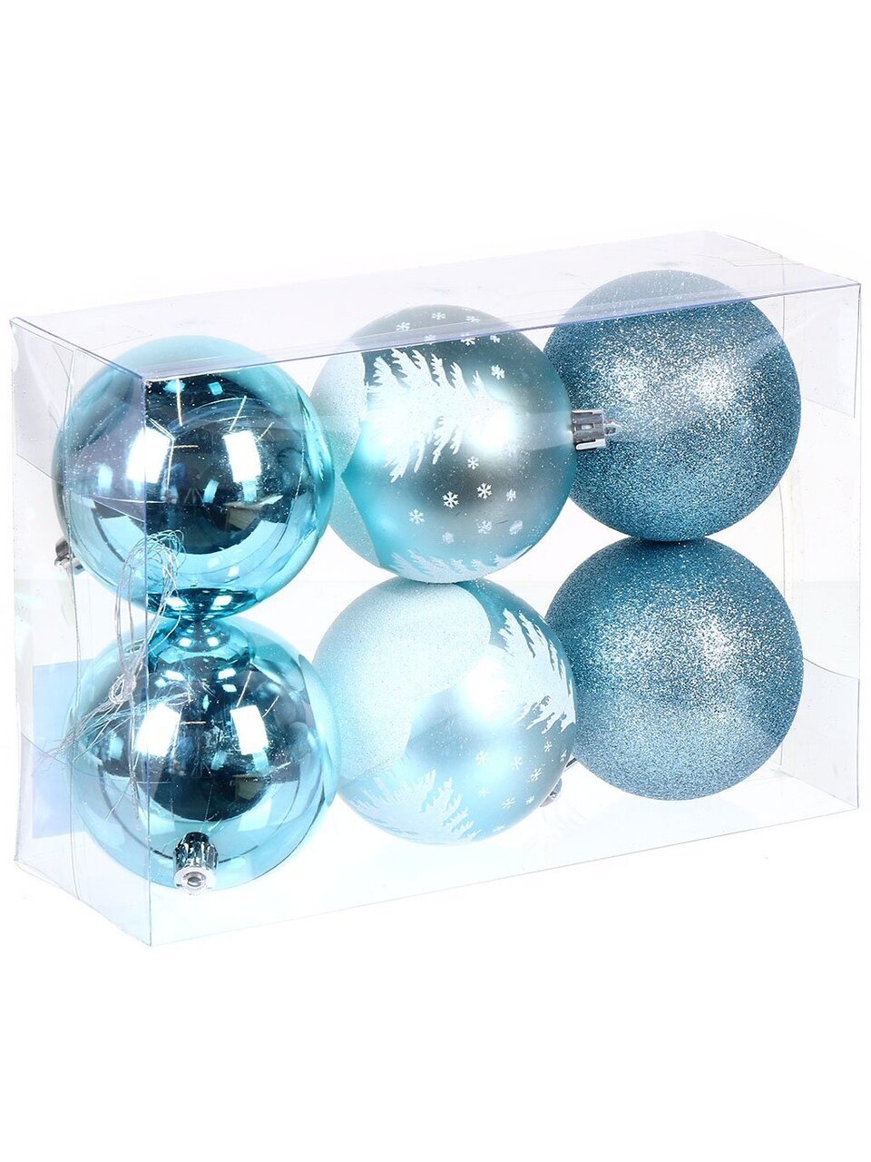 Каждый шар — голубого цвета, диаметр 8 см, высота 8 см, блестящее покрытие с рисунком, материал — пластик, тип крепления — подвеска.