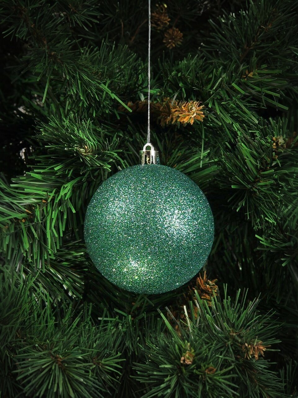 - Оптимальный размер 8 см, блестящее покрытие, яркий зеленый цвет — заметны даже на большой ели