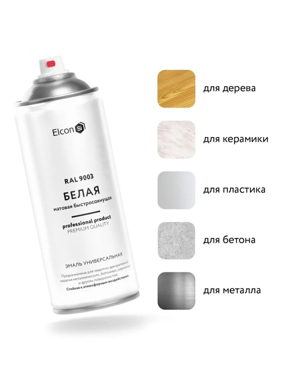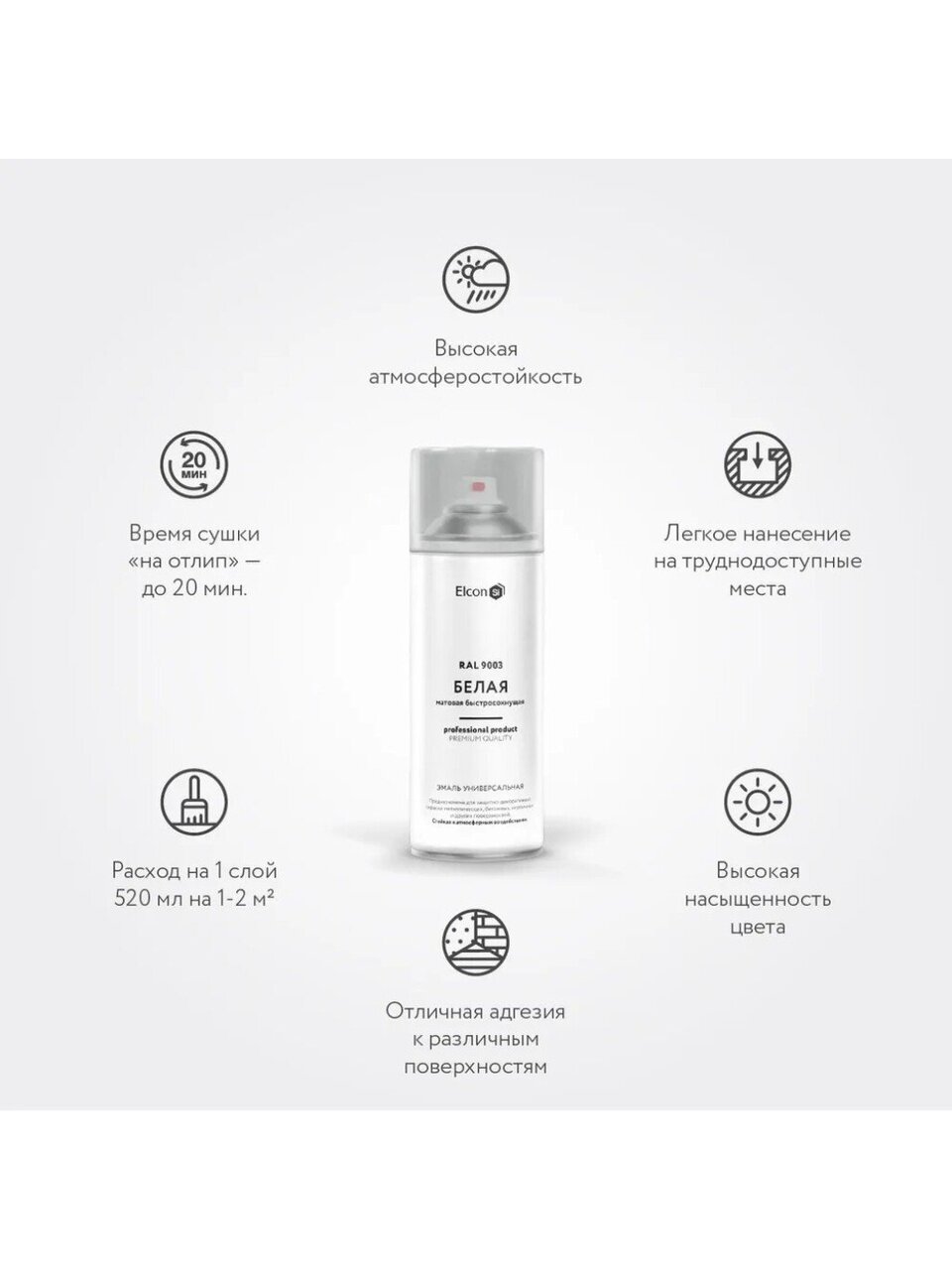 Вы можете приобрести «Эмаль аэрозольная, Elcon, универсальная, быстросохнущая, акриловая, матовая, белая, RAL 9003, 520 мл» и другие товары в нашем интернет-магазине в Нижнем Новгороде по низким ценам и с бесплатным самовывозом.