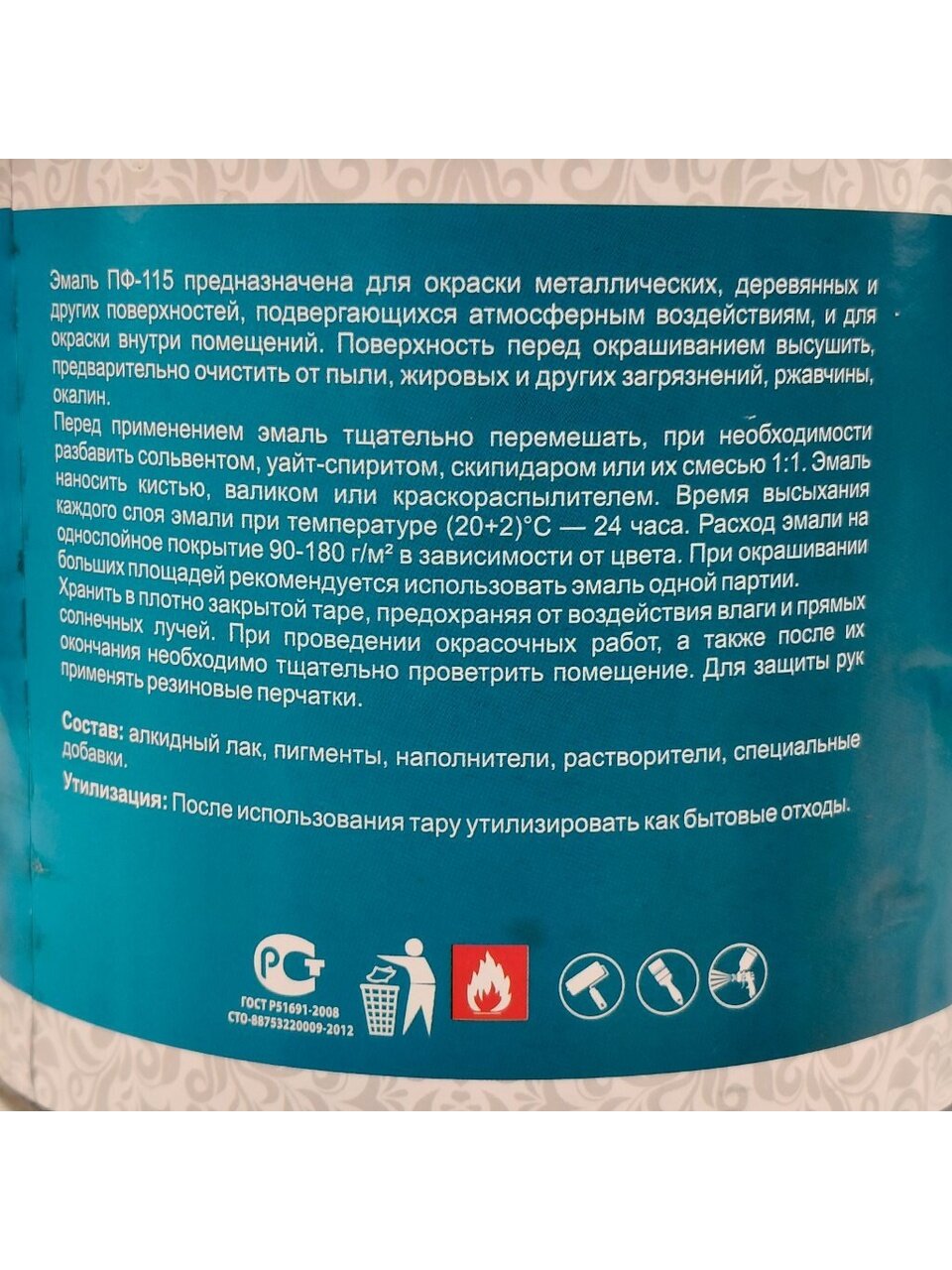 Эмаль ПФ-115 предназначена для окраски металлических, деревянных и других поверхностей, подвергающихся атмосферным воздействиям, и для окраски внутри помещений. Поверхность перед окрашиванием высушить, предварительно очистить от пыли, жировых и других загрязнений, ржавчины окалин.