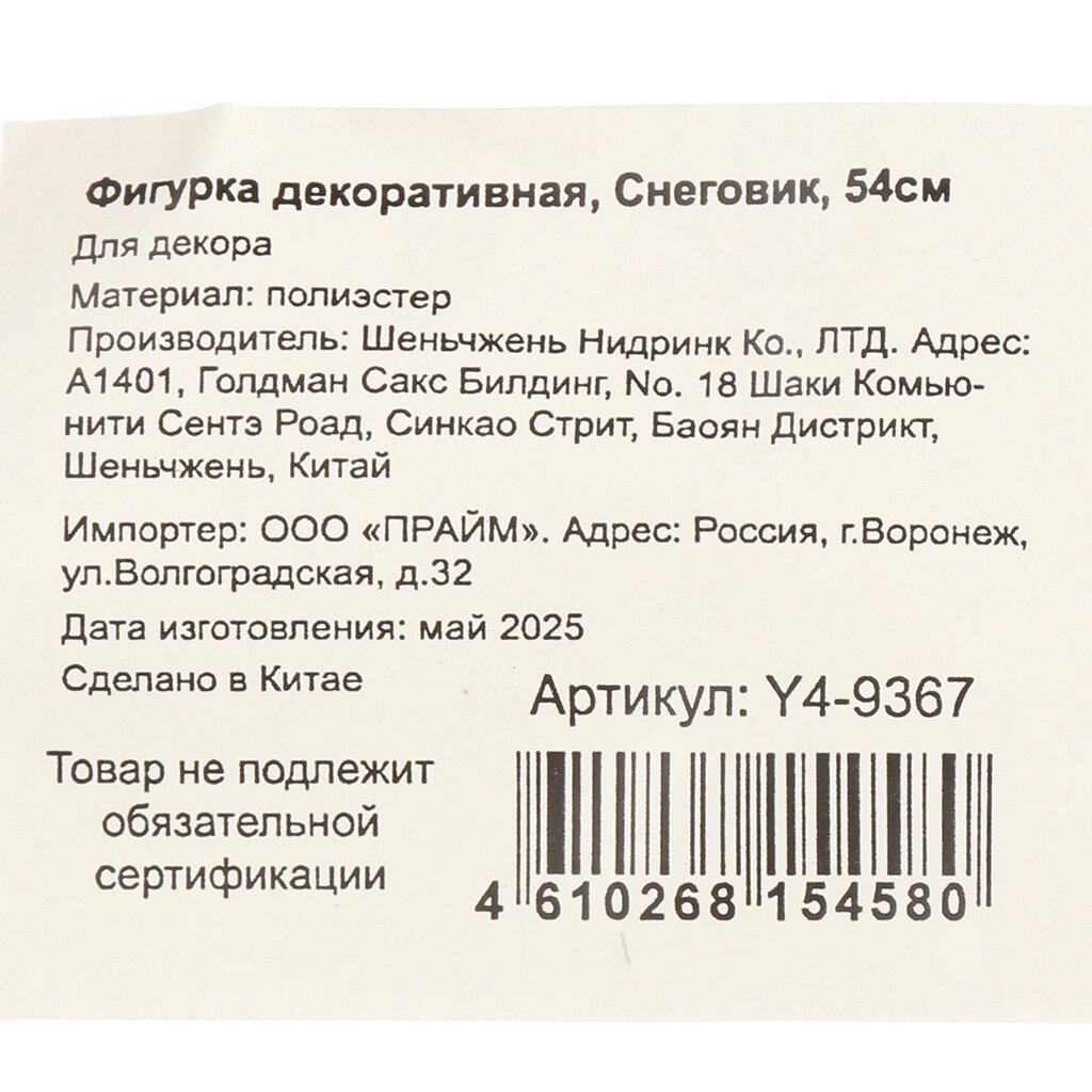 Высота снеговика — 54 см, фигурка относится к категории крупных новогодних украшений. Вес оптимален для устойчивой установки на любой поверхности.