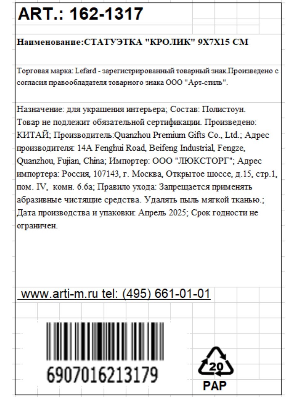 Вы можете приобрести «Статуэтка полистоун, Кролик, 9х7х15 см, Lefard, 162-1317» и другие товары в нашем интернет-магазине в Серпухове по низким ценам и с бесплатным самовывозом.