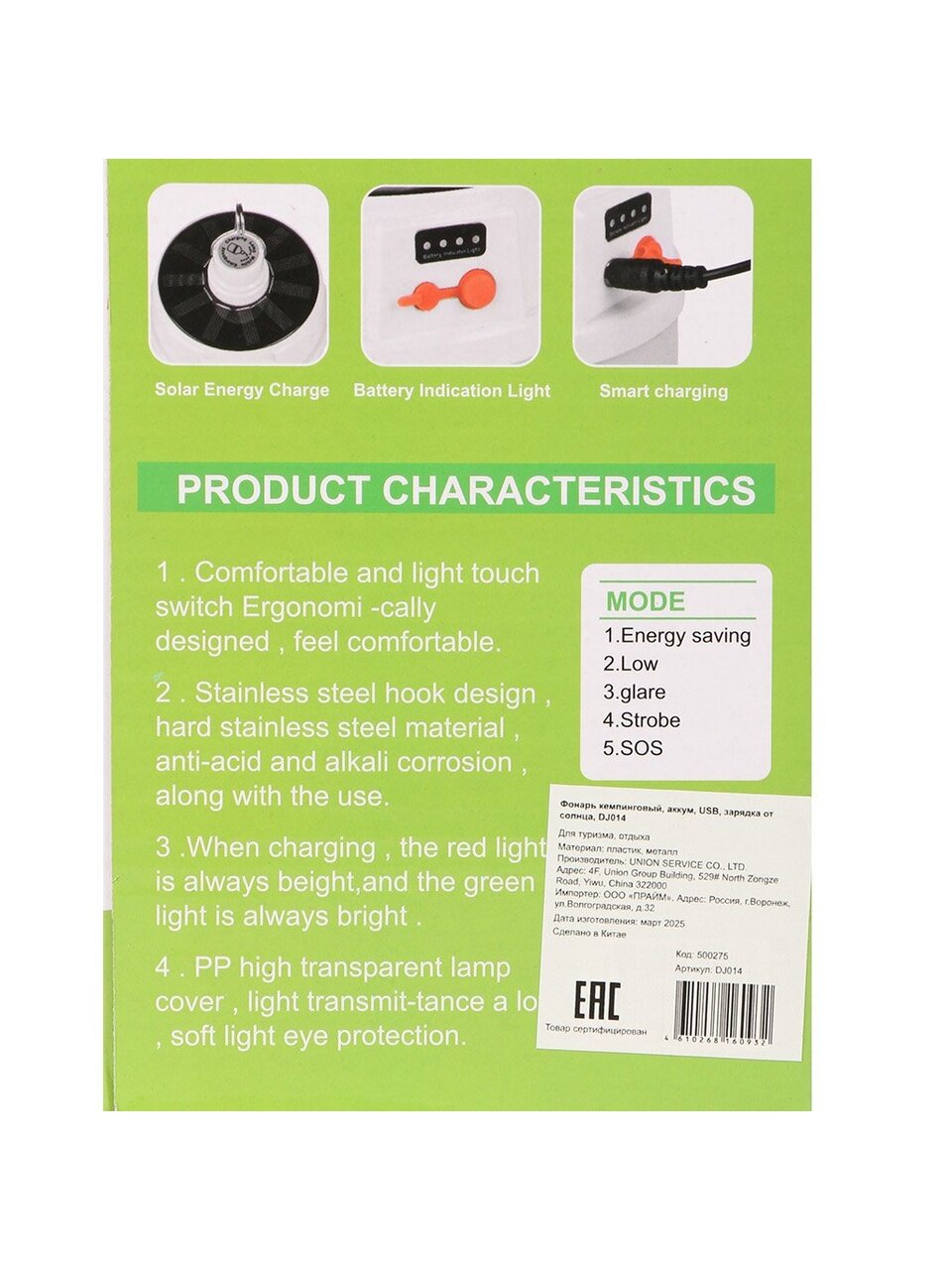 Кемпинговый фонарь DJ014 — надежное решение для освещения на даче, в походе или на пикнике. Компактный корпус из пластика, встроенный аккумулятор и возможность зарядки от USB или солнца делают устройство универсальным выбором для любых условий. Режим SOS обеспечит дополнительную безопасность в экстренных ситуациях. Отличный вариант для людей, ценящих удобство и мобильность.
