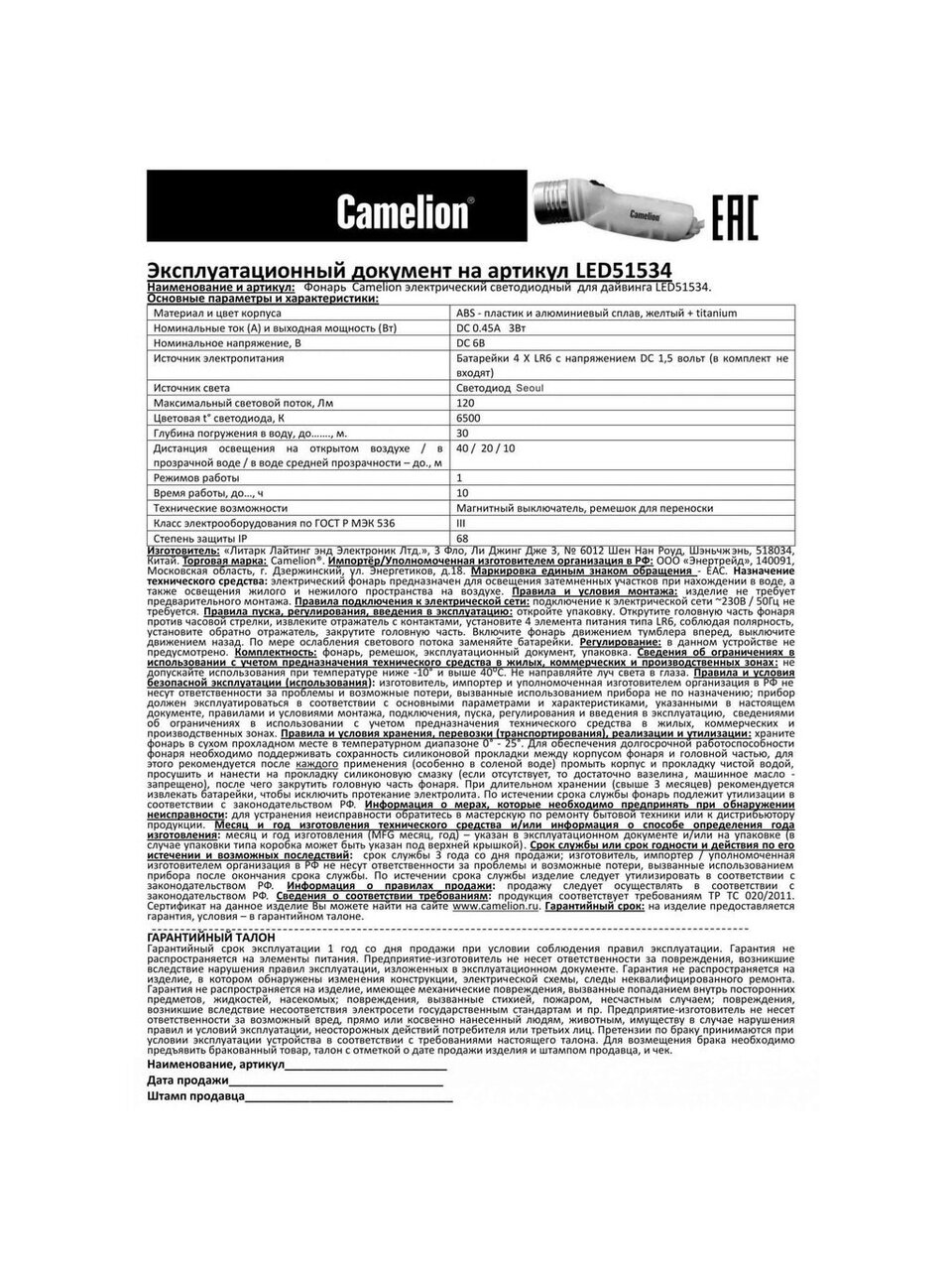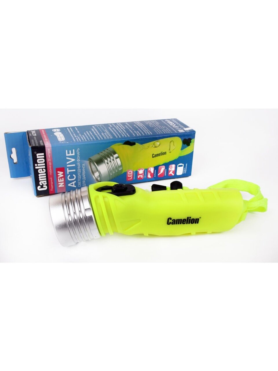 Фонарь Camelion светодиодный для дайвинга водонепроницаем до глубины 30 метров, оснащен выключателем с магнитным исполнительным элементом.