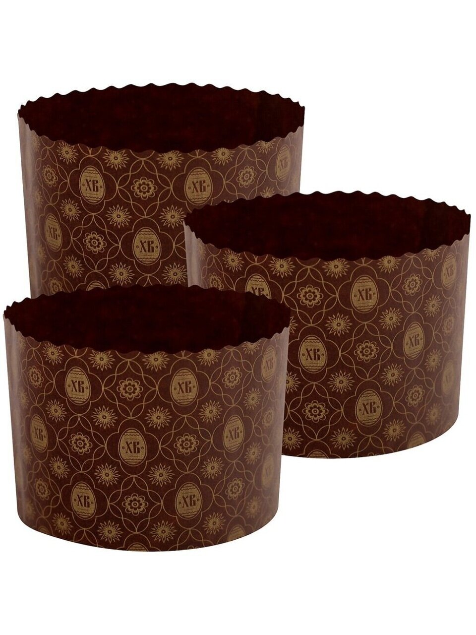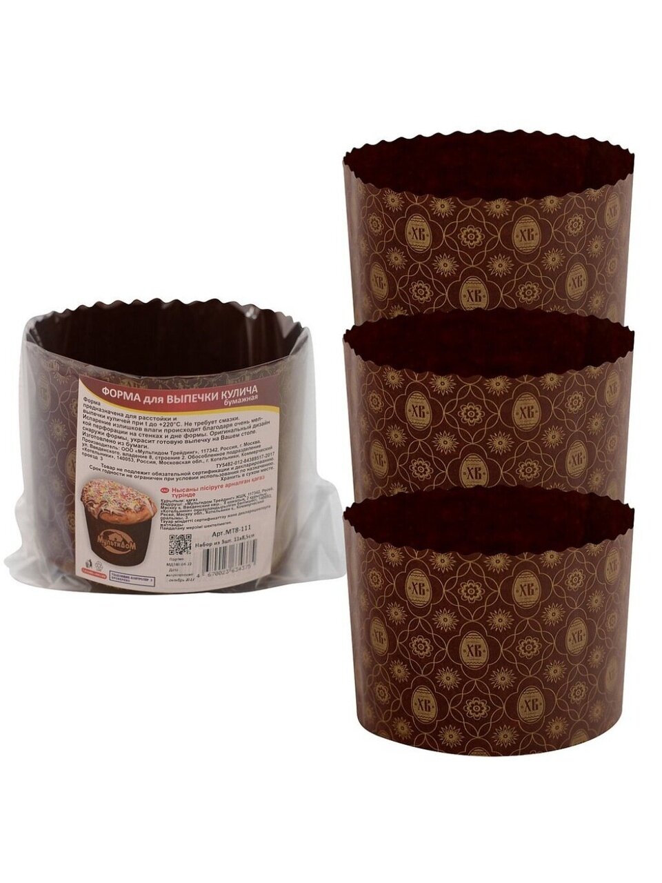 В наборе 3 одноразовые формы диаметром 11 см и высотой 8,5 см. Этого достаточно для приготовления трёх стандартных куличей или порционной выпечки.
