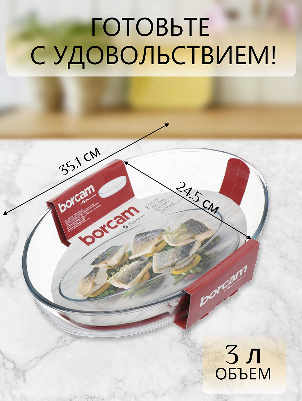 Овальная форма для запекания Borcam 3 л (24,5x35,1 см) — жаропрочное стекло для духовки и СВЧ. Готовьте без хлопот: не впитывает запахи, легко моется, идеально для курицы и рыбы.