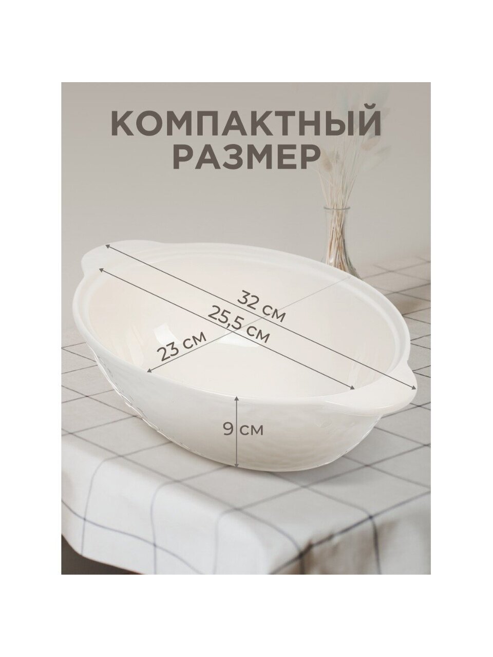 Размер: 20×32×8,5 см, объём — 2 литра. Овальная форма и крышка в комплекте позволяют готовить разнообразные блюда для семьи или гостей.