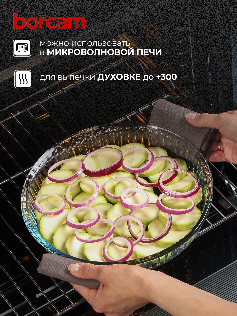 Форма для запекания Borcam 26 см — жаропрочное стекло, универсальный объём 1,72 л, идеальна для домашней кухни и подарка. Надёжность и простота ухода.