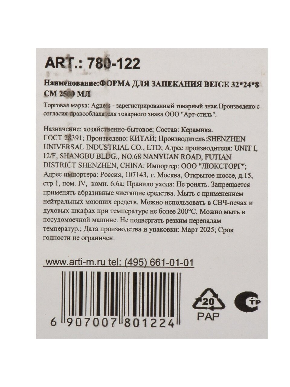 Форма для запекания Agness Beige 24х32 см: идеальный выбор для мяса, овощей и выпечки. Керамика, 2.5 л, подходит для духовки, микроволновки и посудомойки.