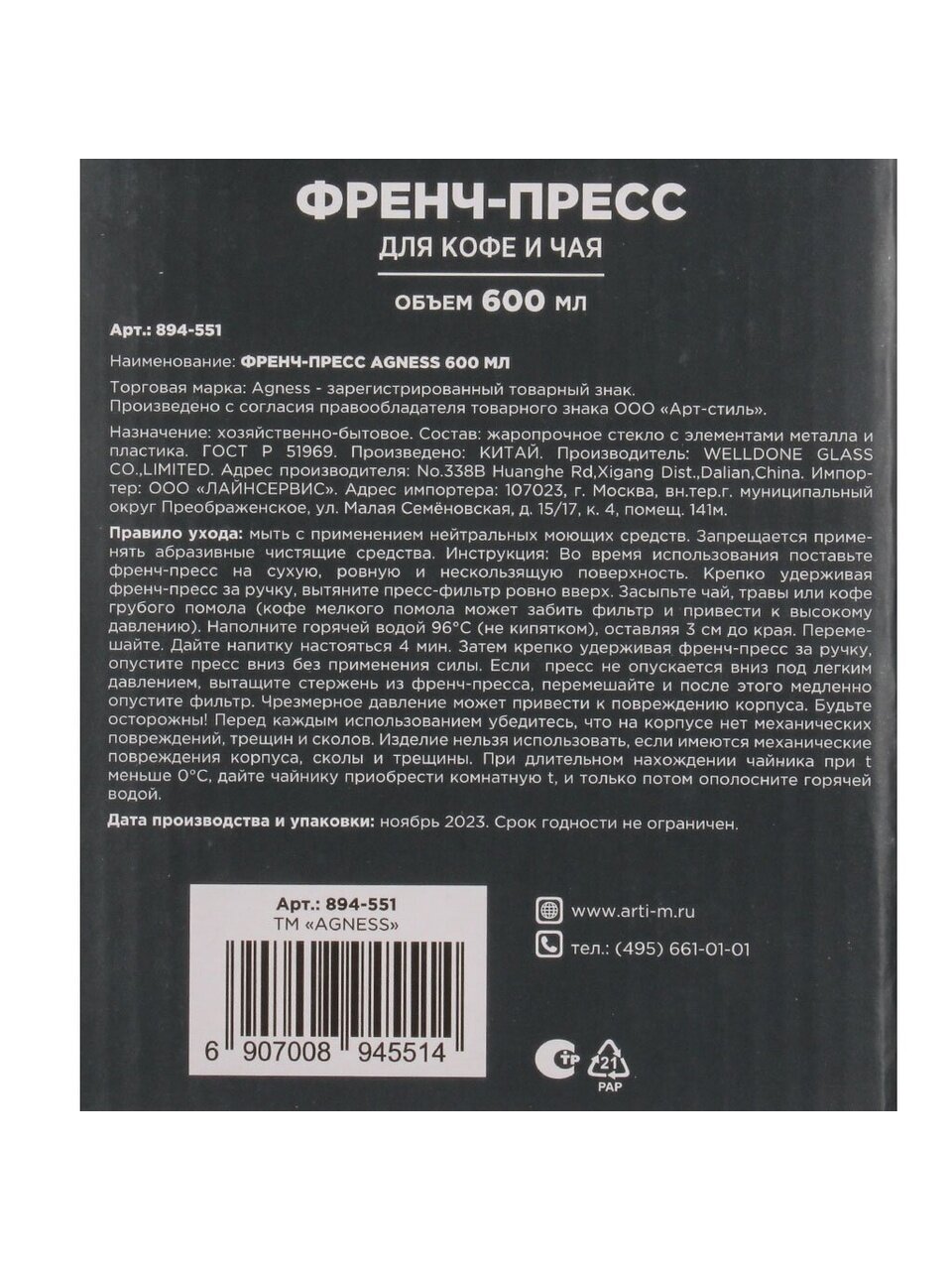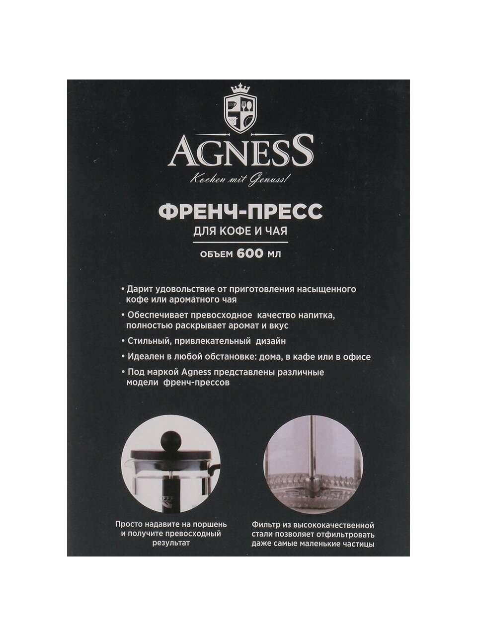Выбирая френч-пресс Agness Kitchen, покупатель получает не просто аксессуар для приготовления напитков, а стильный и надежный инструмент, который экономит время и усилия. Преимущество — возможность быстро приготовить любимый напиток, сохраняя его натуральный вкус и аромат, а также добавить уюта и индивидуальности домашней обстановке. Продукт станет незаменимым помощником для ценителей качественного чая и кофе, а также прекрасным дополнением к коллекции кухонной посуды.