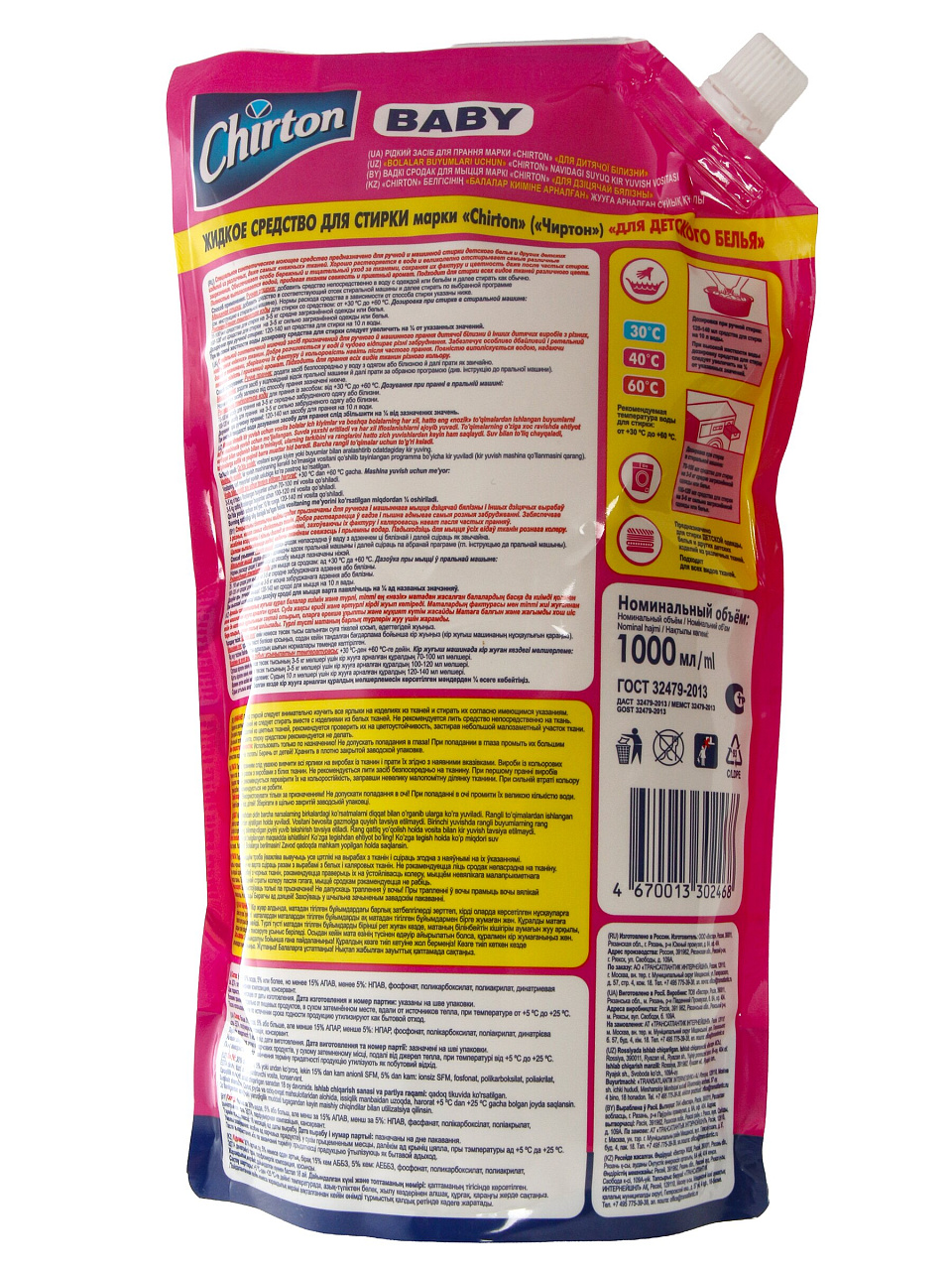 Гель Chirton универсален: подходит для хлопка, синтетики, цветных и белых тканей, не разрушает волокна и сохраняет мягкость детских вещей.