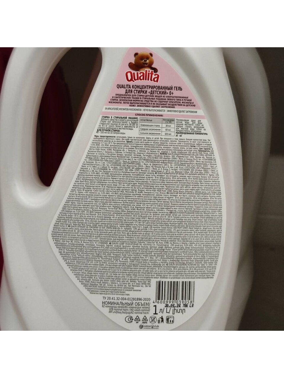 Гель для стирки Qualita 1 л: безопасная забота о детском белье без фосфатов, свежесть и чистота с первой стирки. Подходит для машинной и ручной стирки.