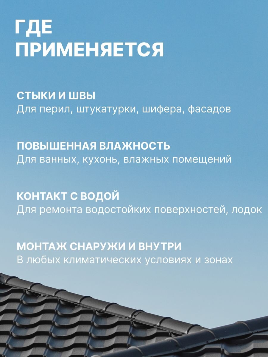 Высококачественный, однокомпонентный герметик на базе синтетического каучука. Подходит для герметизации цветных кровель. Соответствует требованиям ISO 11600 стандарт F типа, 12,5 класс Герметики. Высокоэластичен, можно окрашивать. Обладает отличной адгезией без использования грунтовки к большинству строительных материалов: бетону, штукатурке, металлическим листам и различным типам пластмасс. Отличная адгезия и совместимость с битумом, а также с влажными и маслянистыми основаниями. Устойчив к плесени и грибкам. Выдерживает 4 цикла заморозки.