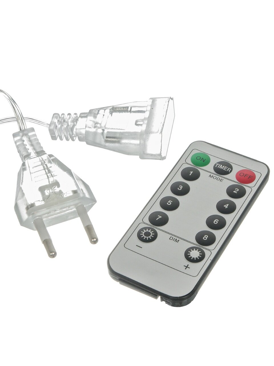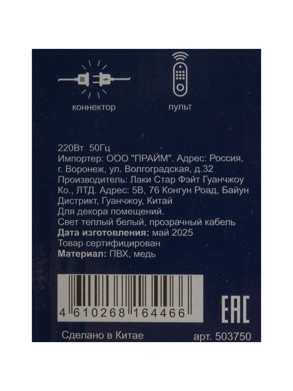 Размер занавеса — 1,5×1,5 м, в комплекте 120 светодиодов на прозрачном проводе. Питание от сети 220В, управление с пульта.