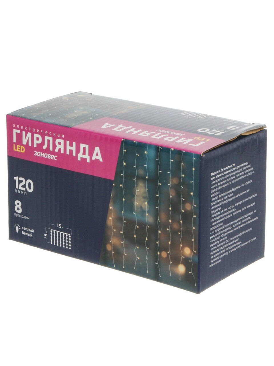 Гирлянда-занавес 120 LED 1,5х1,5 м с пультом: создайте уютный свет за 1 минуту — 8 режимов, теплый белый, прозрачный провод, выгодно для дома и подарка.