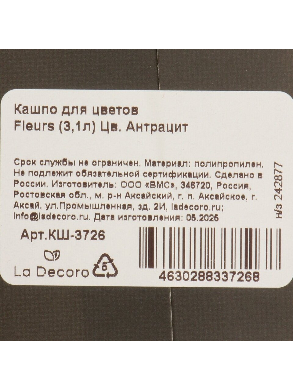 Актуальный серый оттенок антрацит гармонирует с различными стилями интерьера, от минимализма до лофта, и служит отличным фоном для яркой зелени. Кашпо Fleurs легко сочетается с другими аксессуарами для дома, позволяя создавать стильные композиции и подчеркивать индивидуальность пространства. Продукция бренда ВМС отличается высоким качеством изготовления и продуманными деталями, что гарантирует комфортное использование и эстетическое удовольствие.