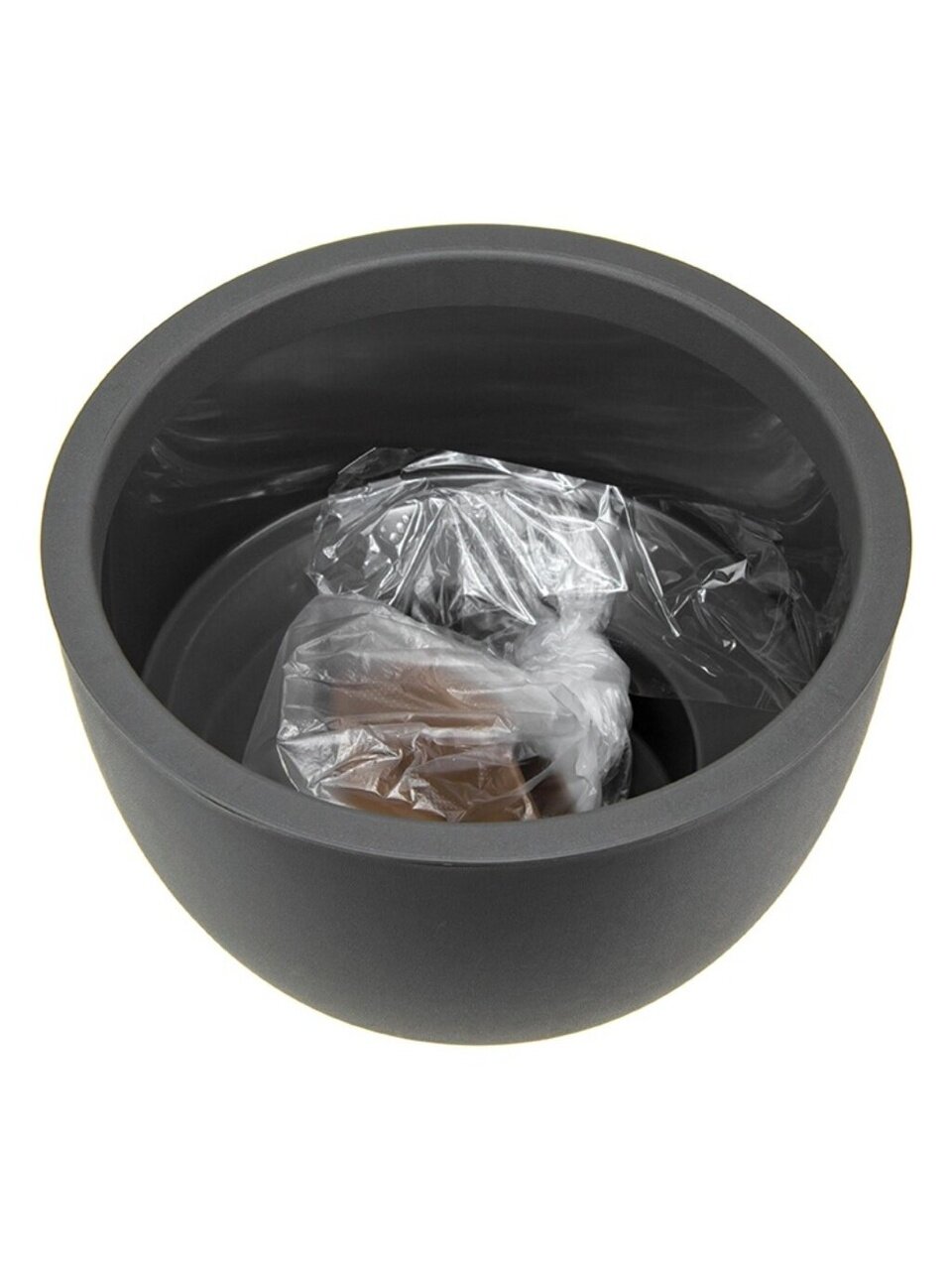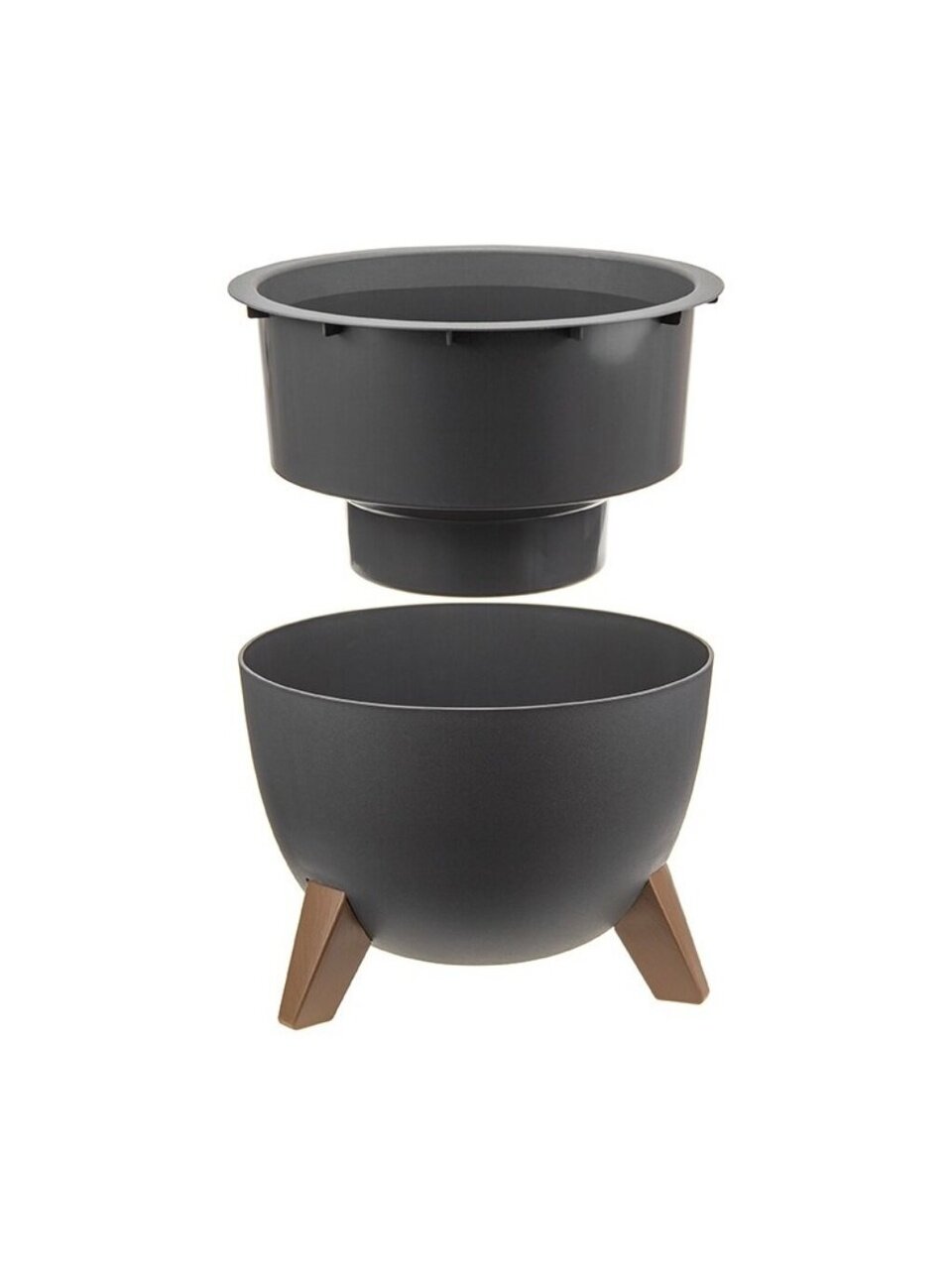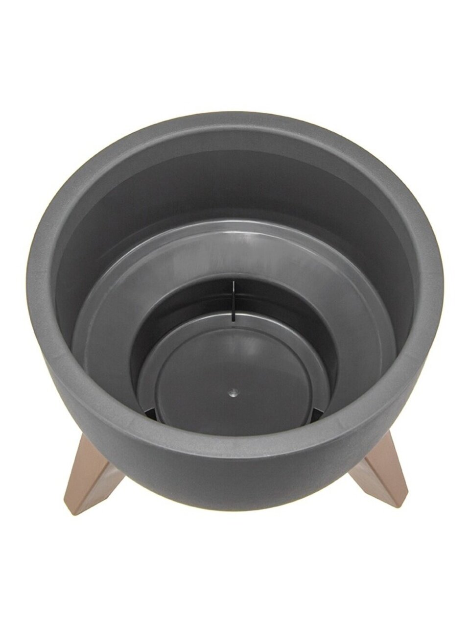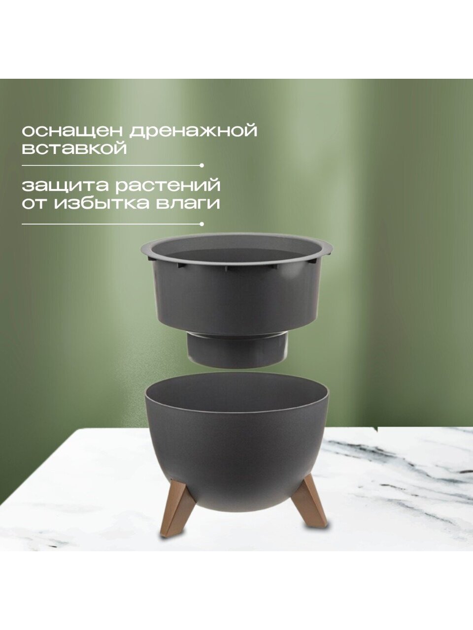 Кашпо со вставкой на ножках имеет круглую форму и матовую поверхность.