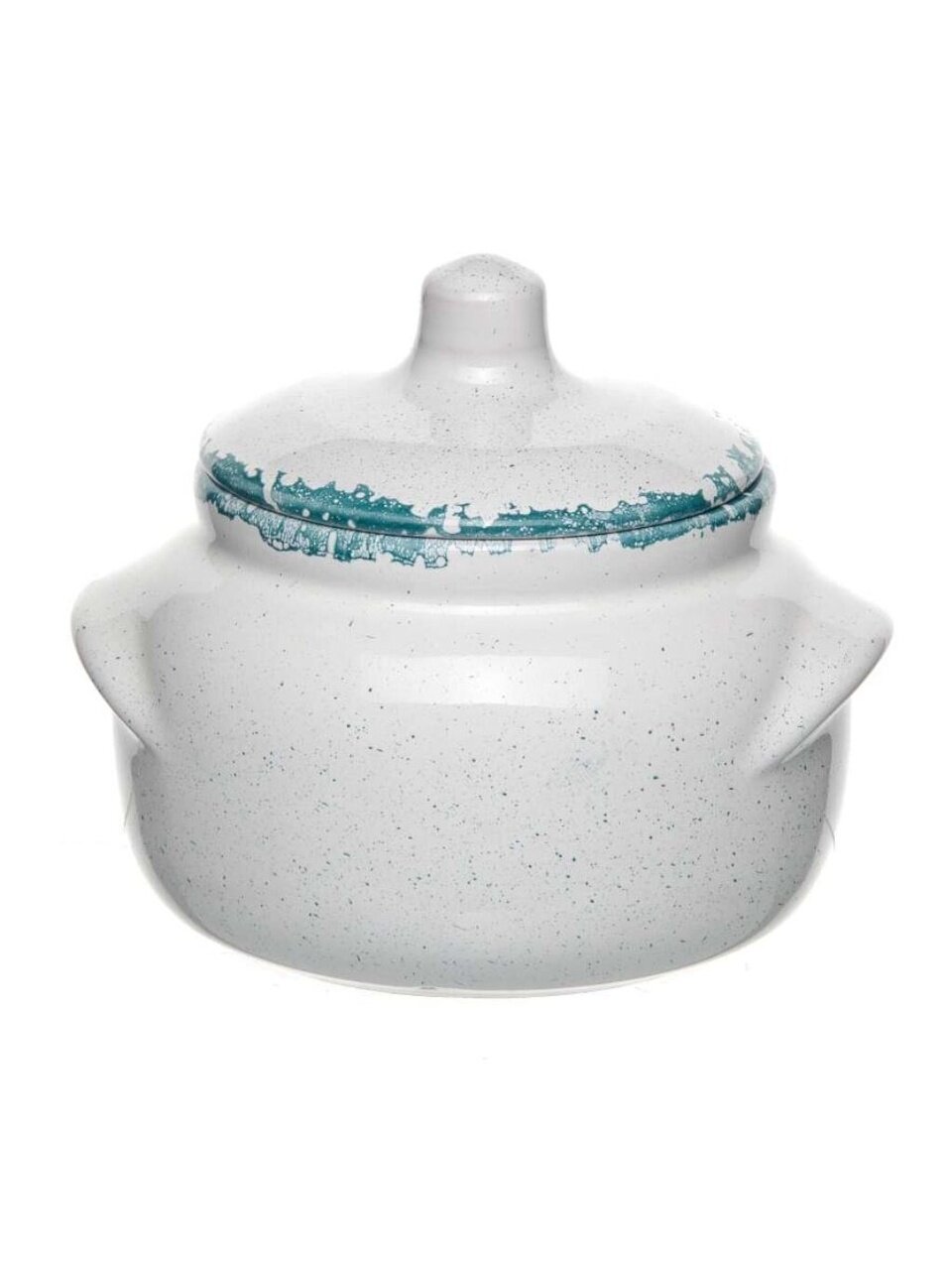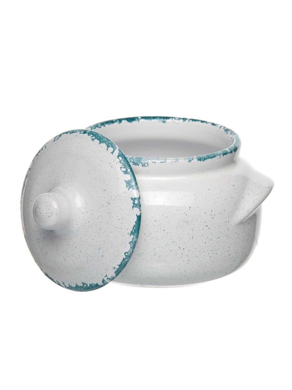 Отличный порционный горшок для жаркого современной формы. Подходит для здорового питания. Для использования в духовке и микроволновке. Можно мыть в посудомоечной машине. Белая глянцевая поверхность с тёмно - бирюзовыми брызгами и каймой.