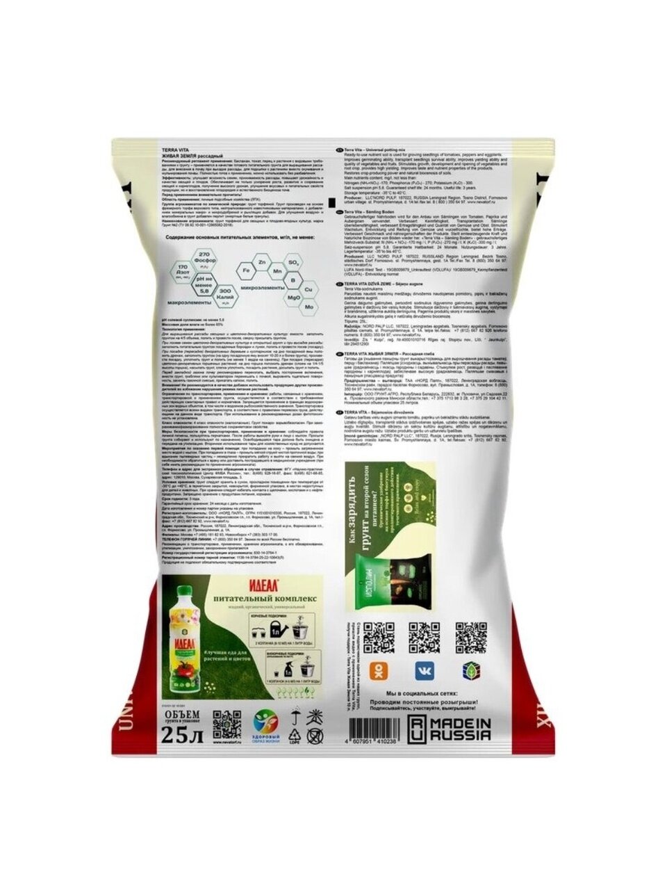 Продукт изготовлен на основе торфов различной степени разложения с добавлением органических субстратов, природных структурирующих компонентов, макро- и микроэлементов.
