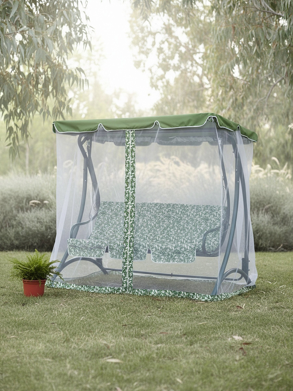 Садовые качели Green Days на 3 места — это оптимальное решение для отдыха на даче, в частном дворе или загородном участке. Благодаря прочному металлическому каркасу и плотной ткани полиэстер с водоотталкивающей отделкой, качели выдерживают до 250 кг и защищают от влаги. Москитная сетка в комплекте позволяет комфортно отдыхать на свежем воздухе даже в сезон комаров. Если вы ищете, какие качели выбрать для дачи, обратите внимание на этот вариант: мягкое сиденье, устойчивые ножки и универсальный зелёный цвет впишутся в любой ландшафт.