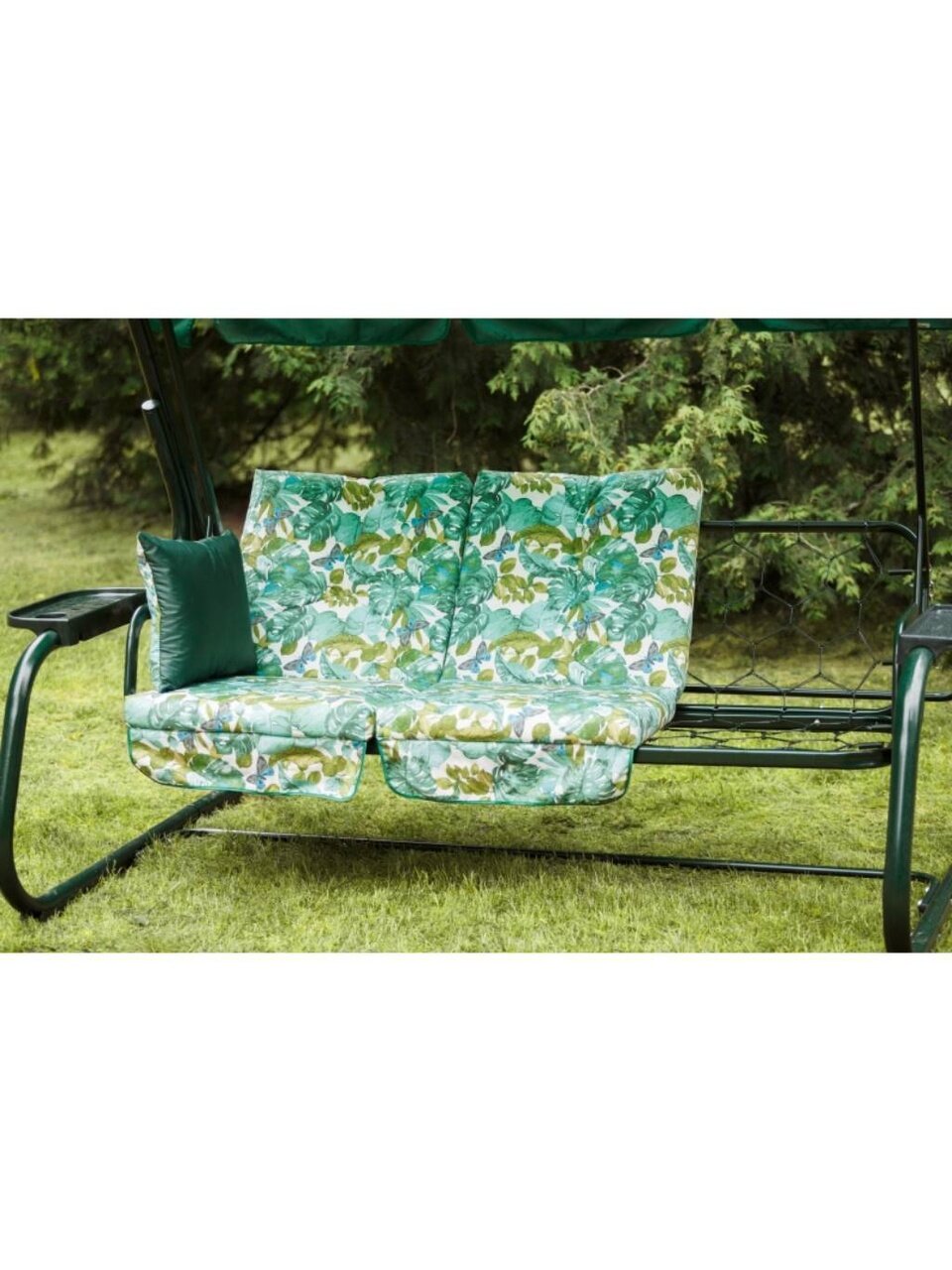 Сиденье и тент выполнены из полиэстера, что делает их устойчивыми к различным погодным условиям. Металлическая решетка основания сиденья и диаметр трубы 51 мм обеспечивают надежность конструкции, выдерживающей нагрузку до 280 кг. Это делает качели идеальными для семейного отдыха.
