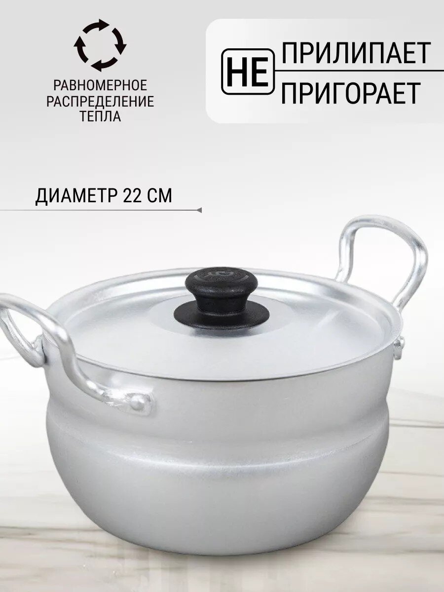 - Безопасный алюминий: прочный корпус и крышка, диаметр 22 см, толщина дна 1.5 мм, срок службы — до 2 лет по гарантии.