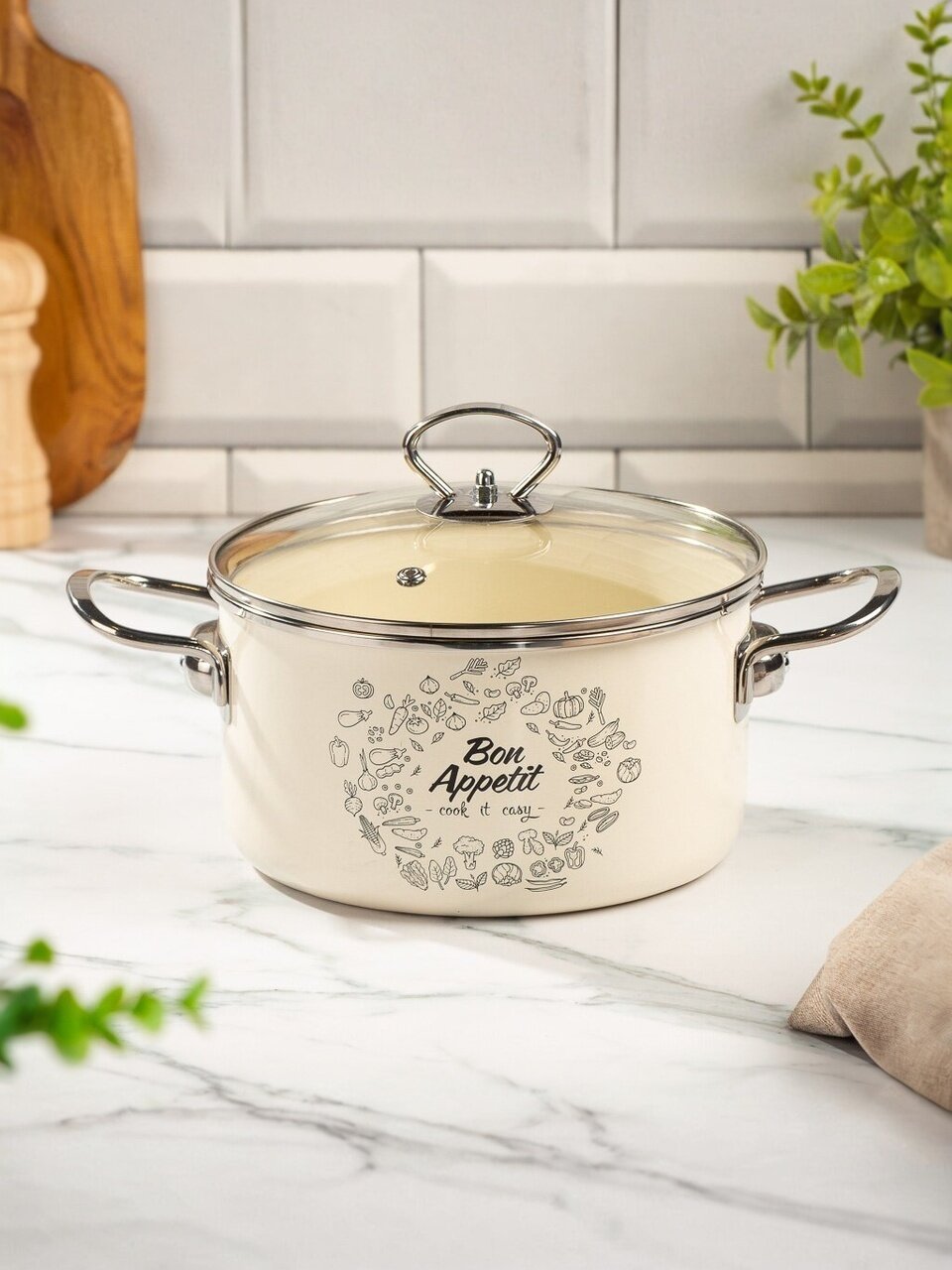 Крышка из прочного стекла позволяет следить за процессом приготовления без необходимости ее снятия, сохраняя тепло и аромат блюд. Цилиндрическая форма кастрюли способствует равномерному прогреванию содержимого, а бежевый цвет добавляет элегантности в интерьер кухни.