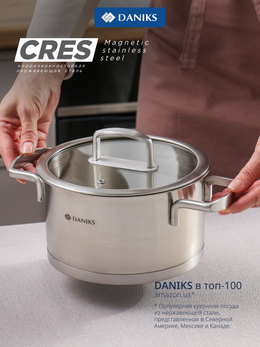 Кастрюля Daniks Тахо 2.6 л из нержавеющей стали 304 с капсульным дном и стеклянной крышкой: оптимальный выбор для индукционных и любых плит — долговечность, универсальность, стиль.