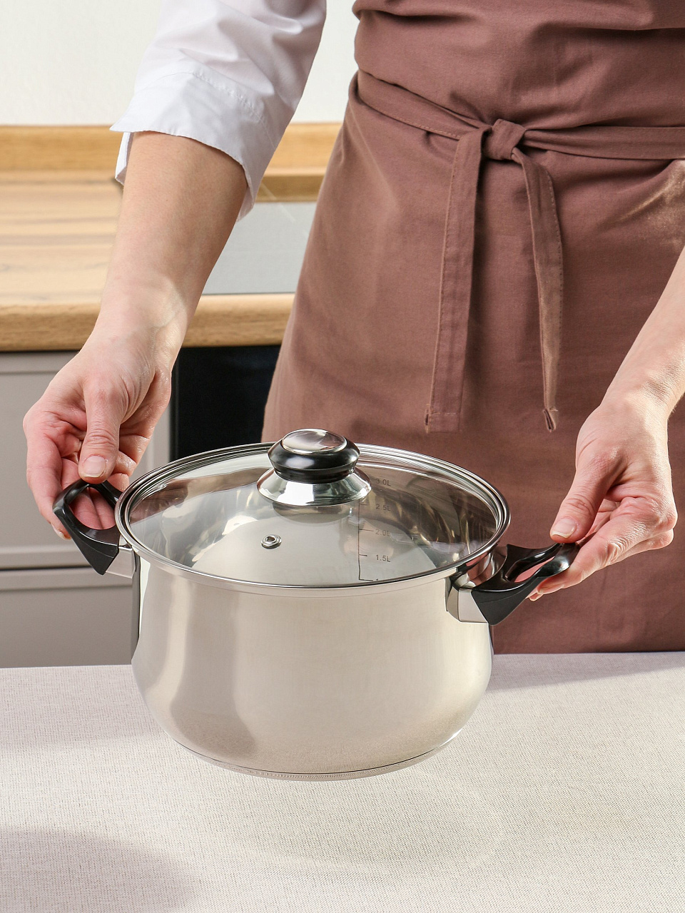 Кастрюля из нержавеющей стали 3.8 л с мерной шкалой и стеклянной крышкой — оптимальный выбор для семьи: удобно готовить суп, макароны, кашу дома и на даче.