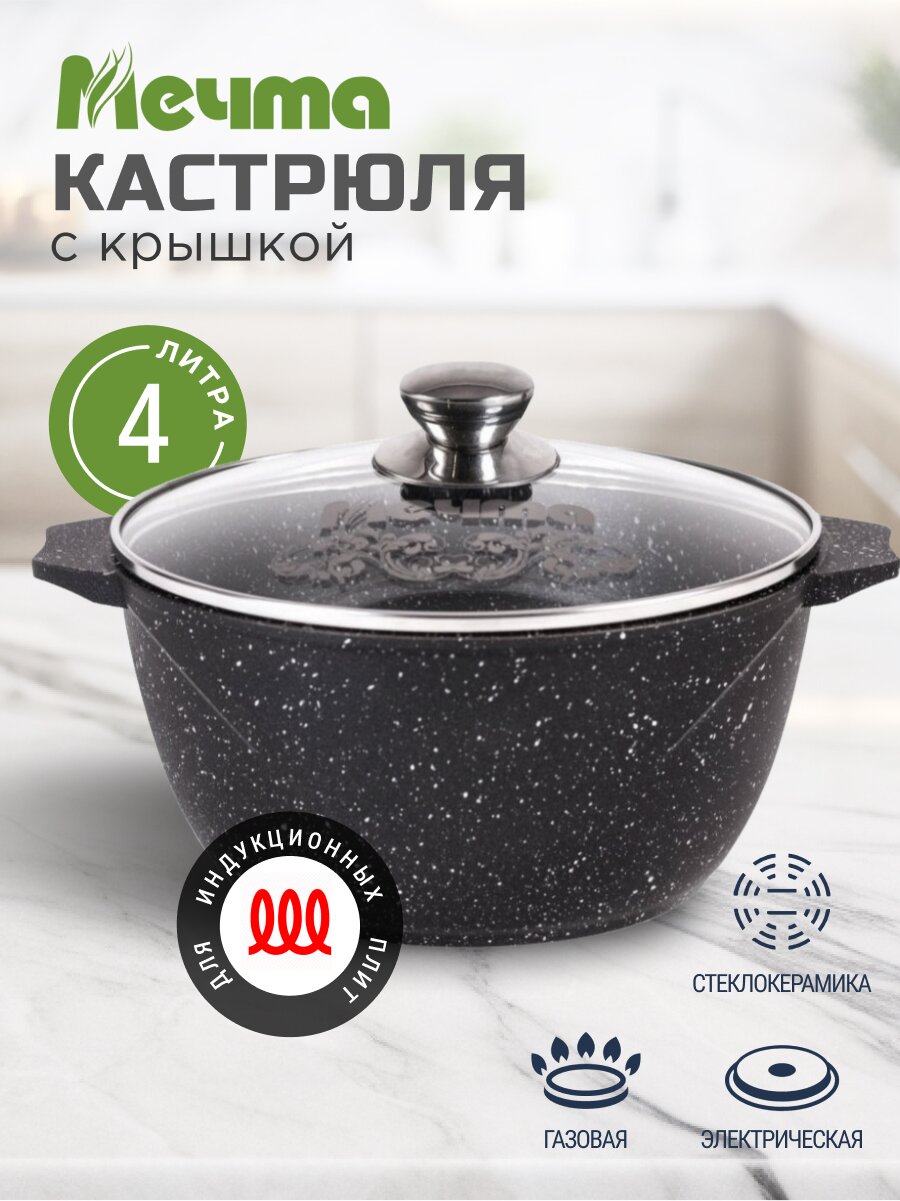 Кастрюля 4 л Мечта Гранит black Induction Pro — антипригарное решение для индукции, газа и духовки. Готовьте легко плов, суп, макароны без пригорания и лишних хлопот.