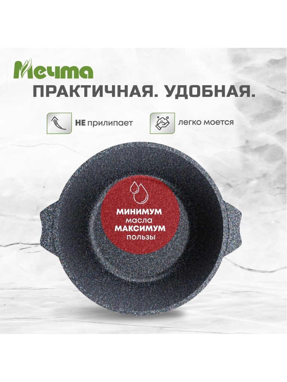 - Гранитное антипригарное покрытие нового поколения — пища не пригорает, легко мыть даже в посудомоечной машине