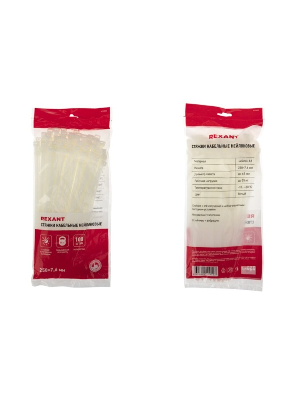 Откройте для себя надежное и удобное решение для организации кабелей с кабельными стяжками Rexant! Эти белые нейлоновые стяжки размером 7.6х250 мм помогут аккуратно и безопасно закрепить кабели, провода и другие элементы.