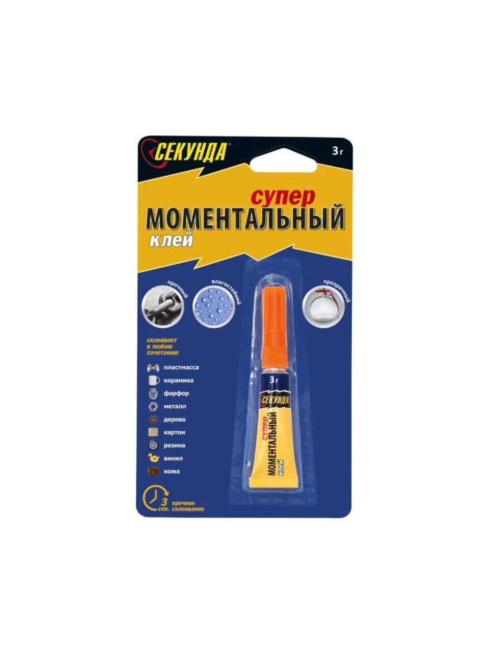 Супер моментальный клей Секунда используется для соединения изделий и деталей, изготовленных из различных материалов, таких как металл, многослойные пластмассы, винил, резина, керамика, дерево, картон, кожа и кожзаменители, пробковое дерево и ДСП.