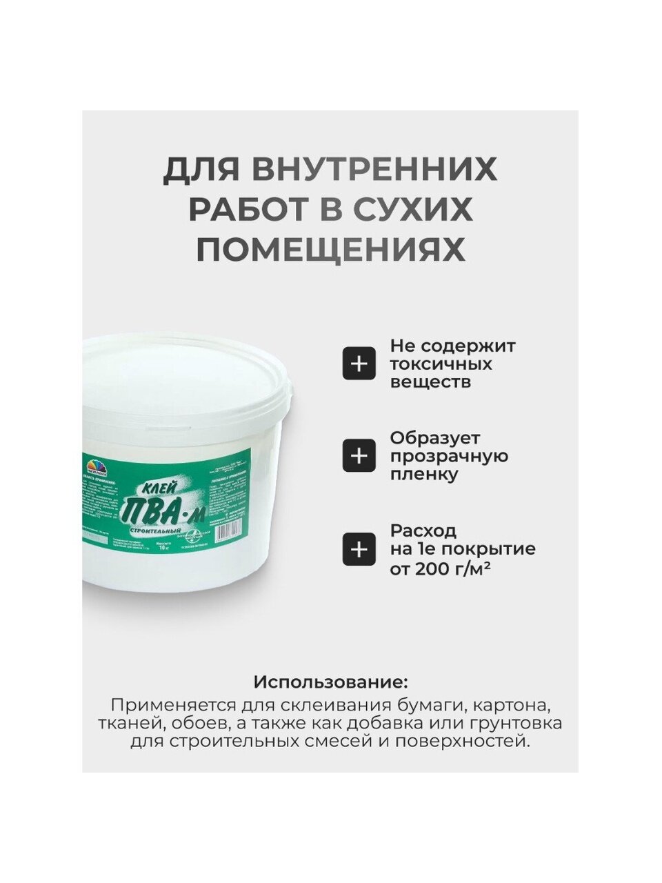 Данный клей применяется для склеивания изделий из бумаги, картона, тканей, приклеивания стекловолоконных, виниловых и бумажных обоев. Может использоваться в качестве модификатора для улучшения технологических и адгезионных свойств сухих строительных смесей, штукатурных, шпатлевочных составов или для грунтования строительных поверхностей.