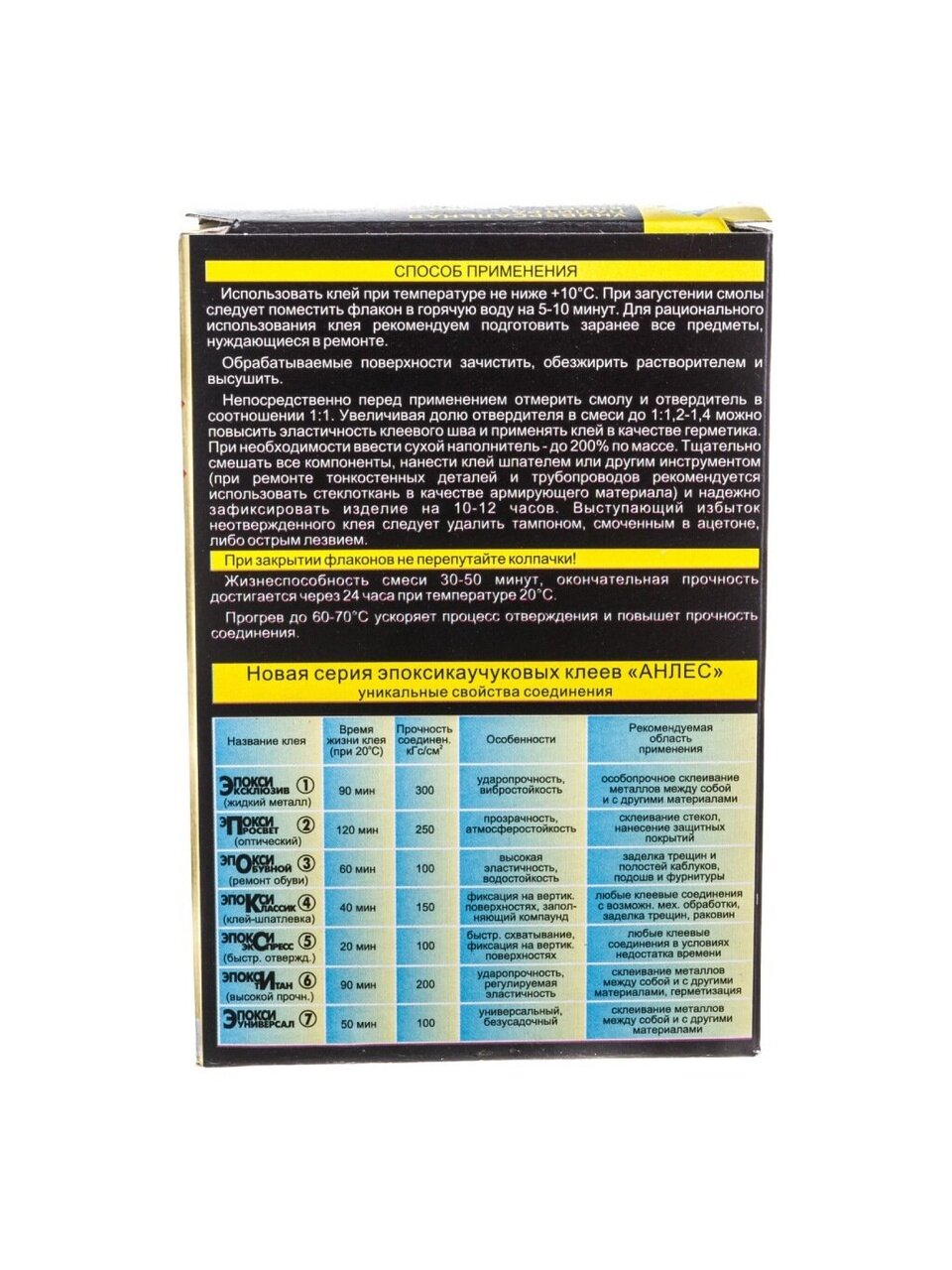 Равнокомпонентный, ударопрочный, эластичный, повышенной прочности клей Анлес для надежного склеивания однородных и разнородных материалов (металлов, пластмасс, дерева, стекла, керамики, фарфора, бетона). Подходит для соединения деталей, подверженных вибрации и ударным нагрузкам, заполнения трещин, отверстий, пор. Регулируемая эластичность.