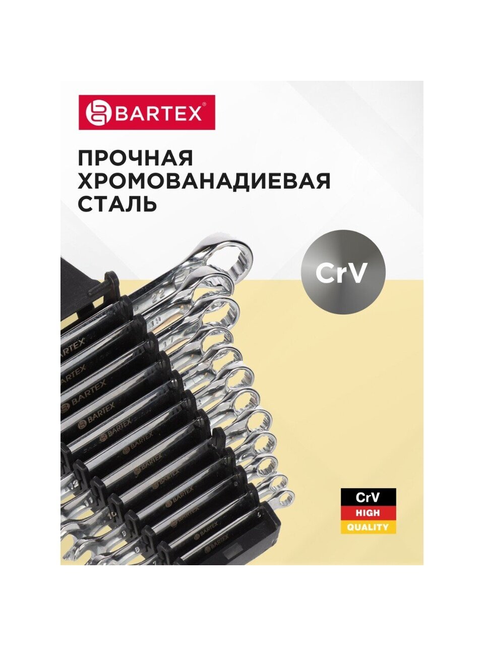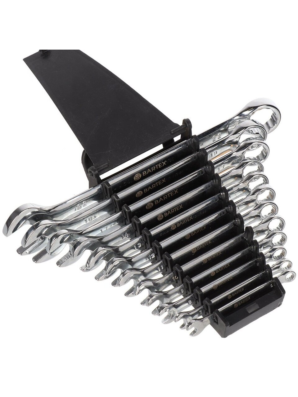 Комбинированный набор Bartex состоит из 12 рожковых и накидных ключей. U-образный рабочий профиль захватывает крепеж с двух или трех сторон. Профиль О захватывает крепежный элемент со всех сторон, что позволяет работать с тугими соединениями.