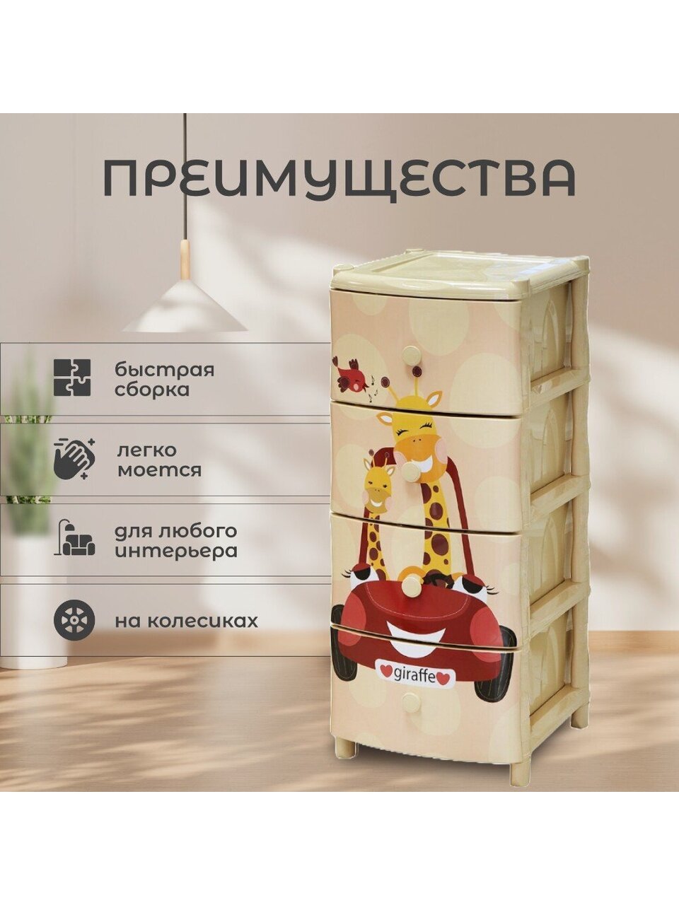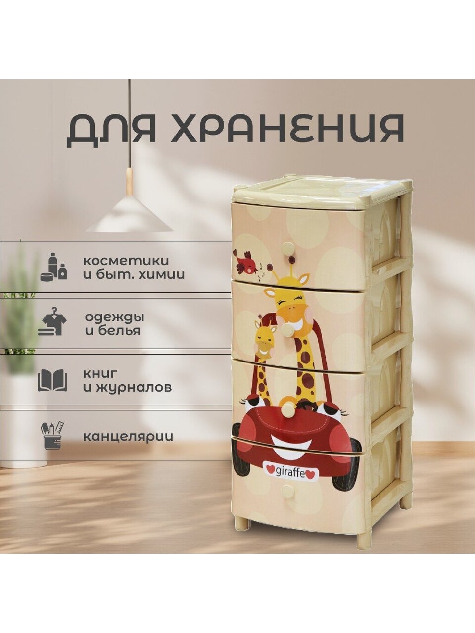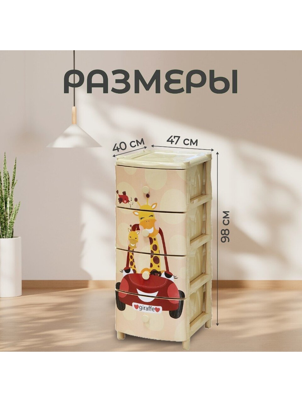 Вы можете приобрести «Комод детский 4 ящика, Жираф на машине, 40х47х98 см, Элластик-Пласт» и другие товары в нашем интернет-магазине в Воронеже по низким ценам и с бесплатным самовывозом.