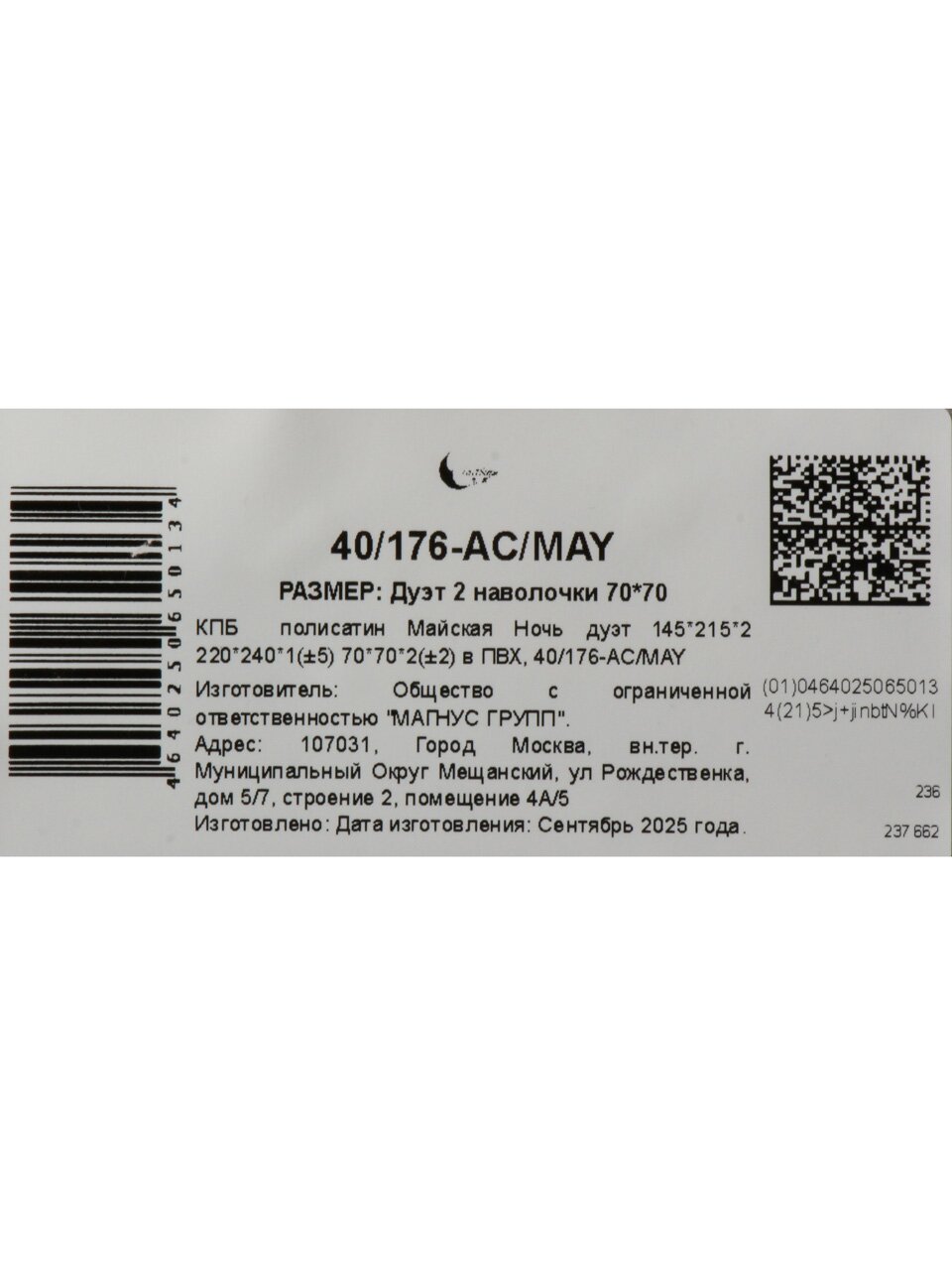 Семейное постельное белье «Майская ночь» — это практичный комплект из прочного полисатина (смесь хлопка, вискозы и полиэстера), который сочетает мягкость и долговечность. Благодаря универсальным размерам, этот набор легко подойдёт для кроватей стандартных и увеличенных габаритов. Если вы задаётесь вопросом, какой комплект постельного белья выбрать для семьи или как выбрать постельное белье для двуспальной кровати, обратите внимание на семейную размерность: два отдельных пододеяльника и большая простыня обеспечивают комфорт каждому.