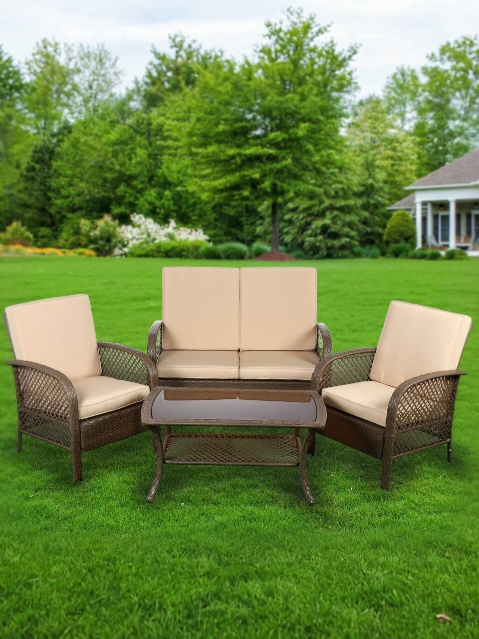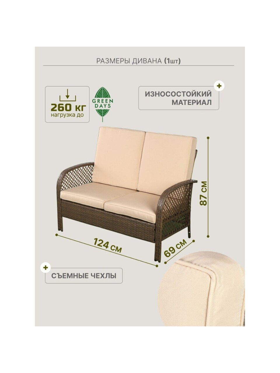 Вы можете приобрести «Мебель садовая Green Days, бежевая, стол, 105х60х48 см, 2 кресла, 1 диван, подушка, 130 кг, FFSET-1008» и другие товары в нашем интернет-магазине в Таганроге по низким ценам и с бесплатным самовывозом.