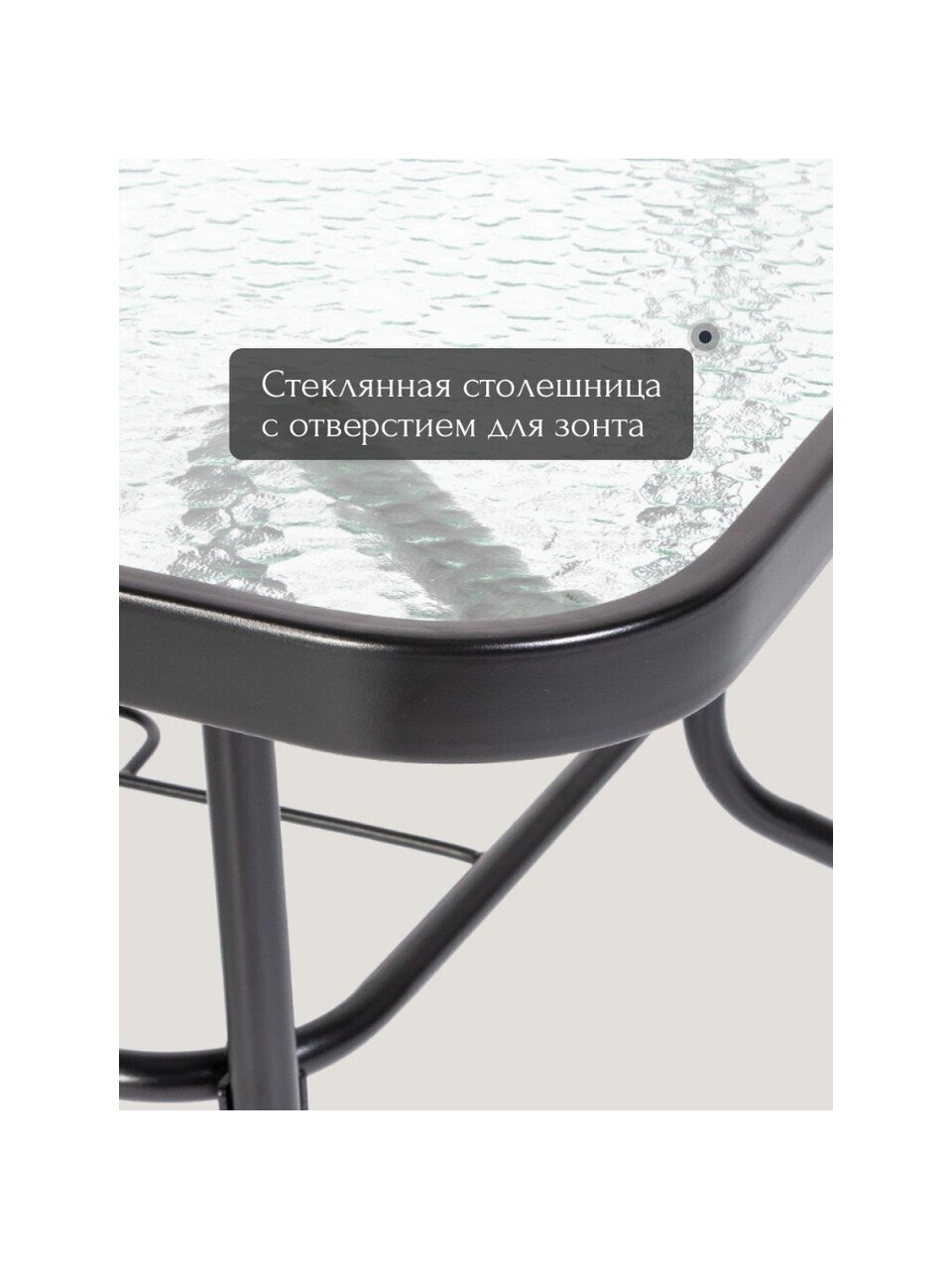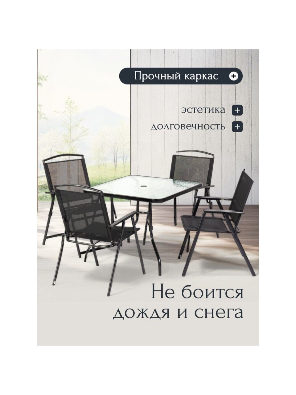 Комплект мебели Вилена обладает уникальной особенностью: в центре столешницы предусмотрено отверстие для зонта, что позволяет наслаждаться отдыхом на свежем воздухе даже в солнечные дни. Складная конструкция мебели обеспечивает легкость в хранении и транспортировке, что особенно важно для сезонного использования.