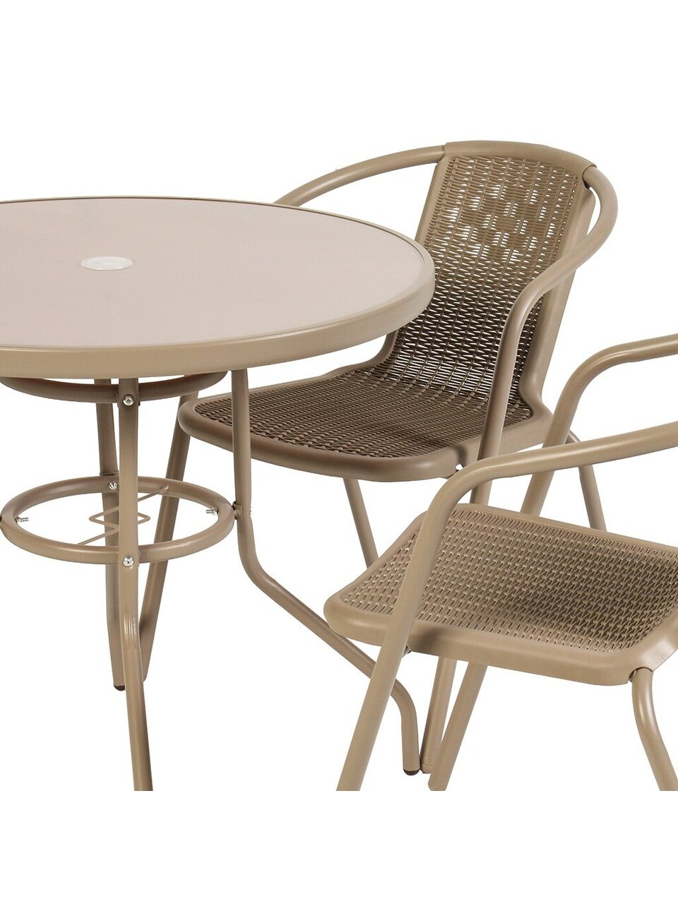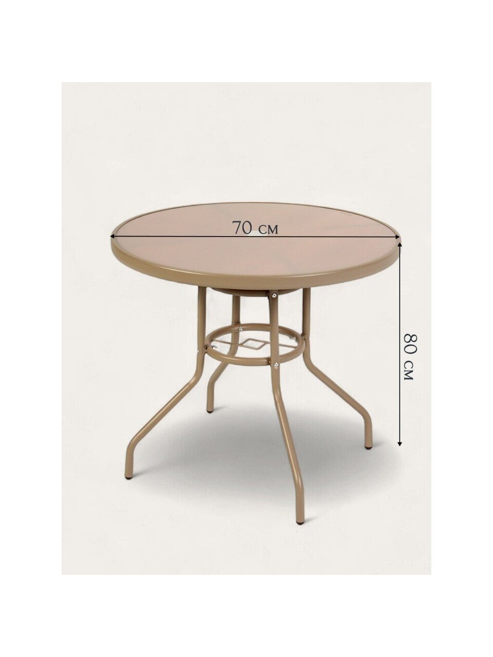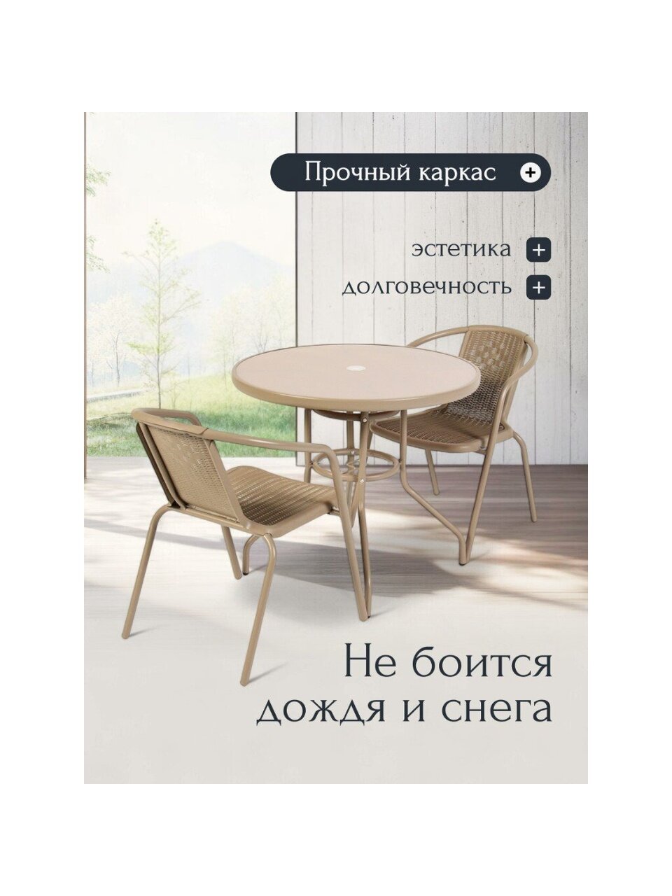 Компактные размеры делают комплект удобным для небольших пространств: балконов, террас и веранд. Стол диаметром 70 см и высотой 80 см обеспечивает достаточно места для сервировки завтрака, обеда или вечерних посиделок. Стулья размером 43х57х72 см выдерживают нагрузку до 110 кг, что гарантирует надежность и безопасность использования.