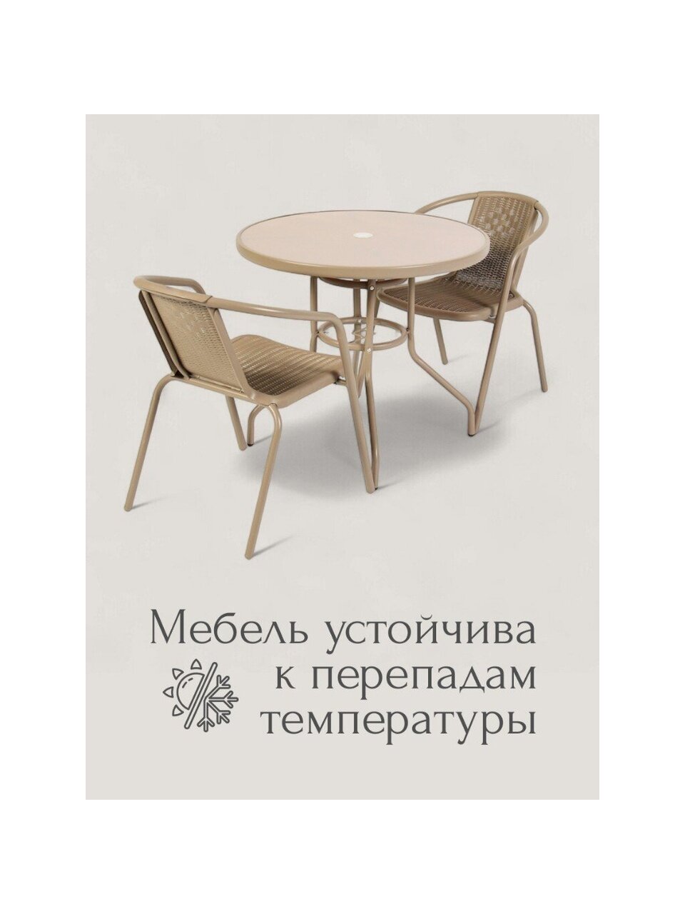 Стильная и практичная мебель садовая Пуэрто NEW — идеальное решение для комфортного отдыха на даче, в саду, на балконе или в уличном кафе. Комплект состоит из круглого стола и двух удобных стульев, что позволяет создать уютную атмосферу для двоих. Современный дизайн в универсальном бежевом цвете гармонично впишется в любой экстерьер и подчеркнет индивидуальность пространства.
