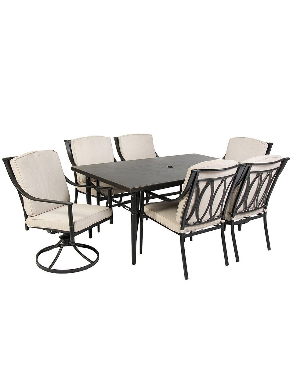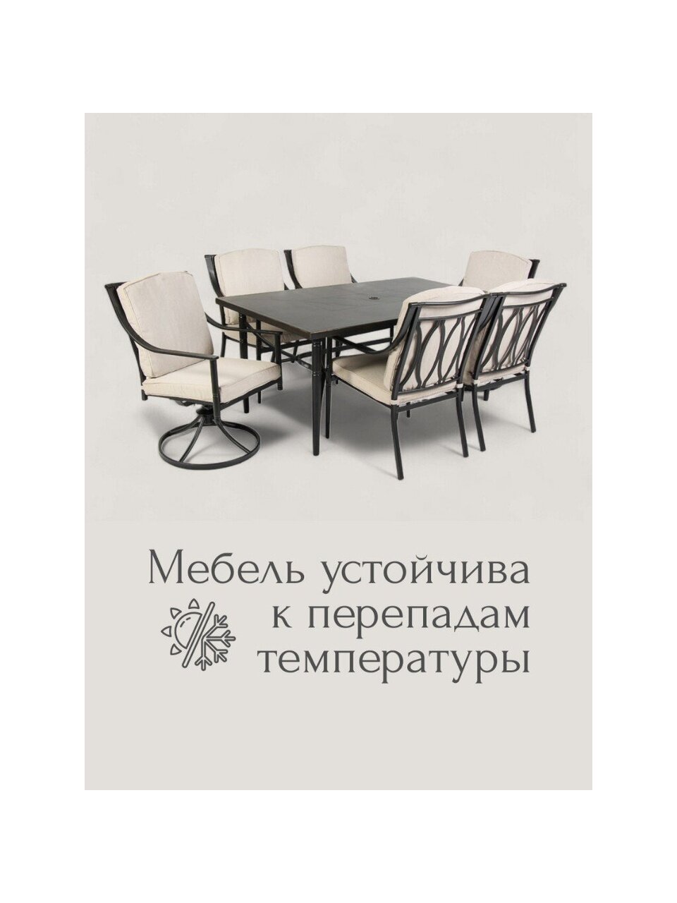 Мебель садовая Нойс – стильное и практичное решение для обустройства дачного участка, террасы, кухни, кафе или дома. Современный дизайн в универсальном черном цвете гармонично впишется в любой экстерьер, создавая атмосферу уюта и комфорта для отдыха и приема гостей. Комплект рассчитан на 6 персон и включает прямоугольный стол размером 173х102х75 см и 6 удобных стульев с подлокотниками и мягкими подушками размером 60х62х91 см. Прочная конструкция с каркасом обеспечивает надежность и долговечность эксплуатации, максимальная нагрузка как на стол, так и на стулья составляет 120 кг. Отверстие для зонта в центре столешницы позволит наслаждаться свежим воздухом даже в солнечную погоду.