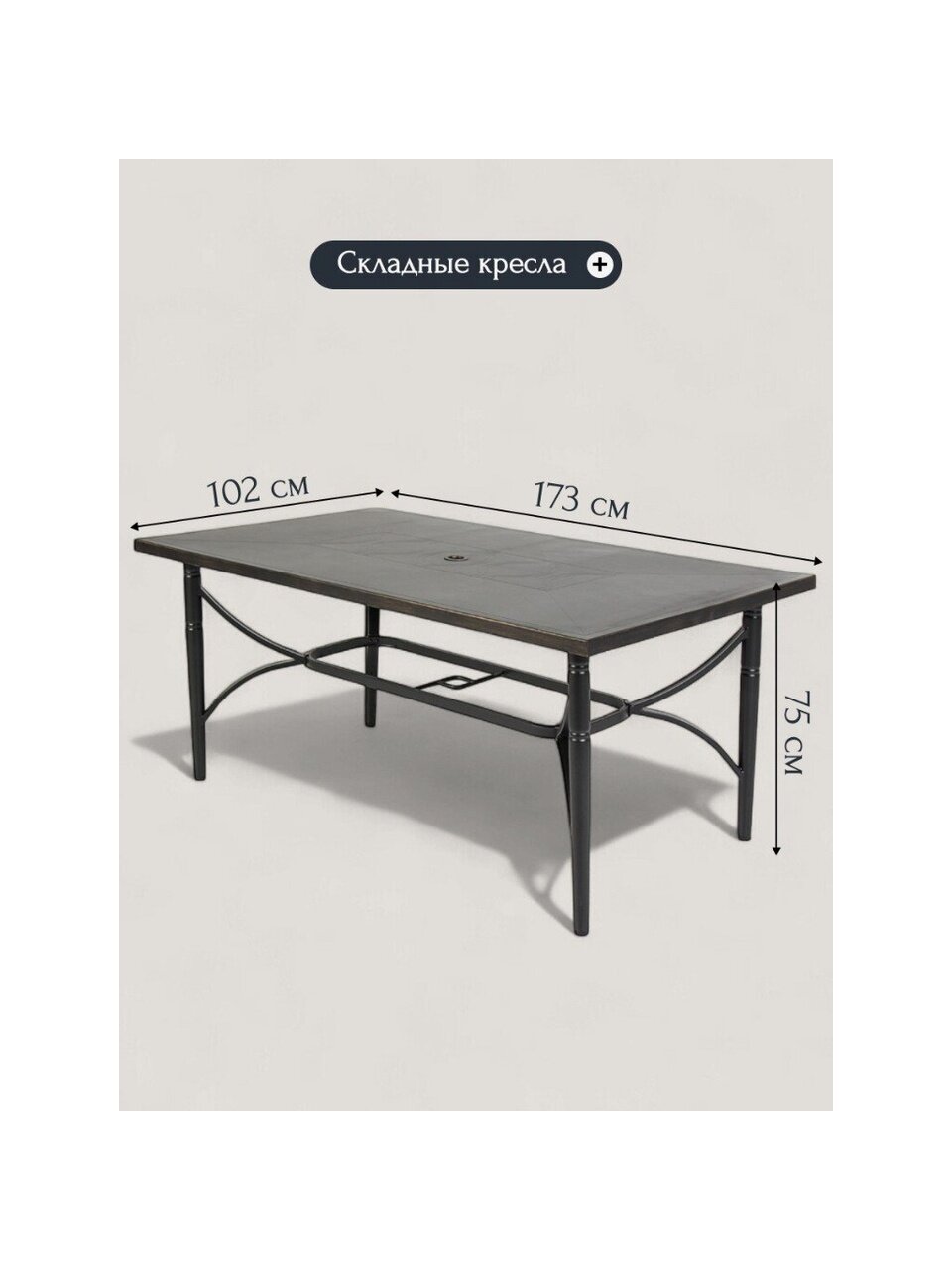 - отверстие для зонта в центре столешницы – возможность создать тень в жаркий день;