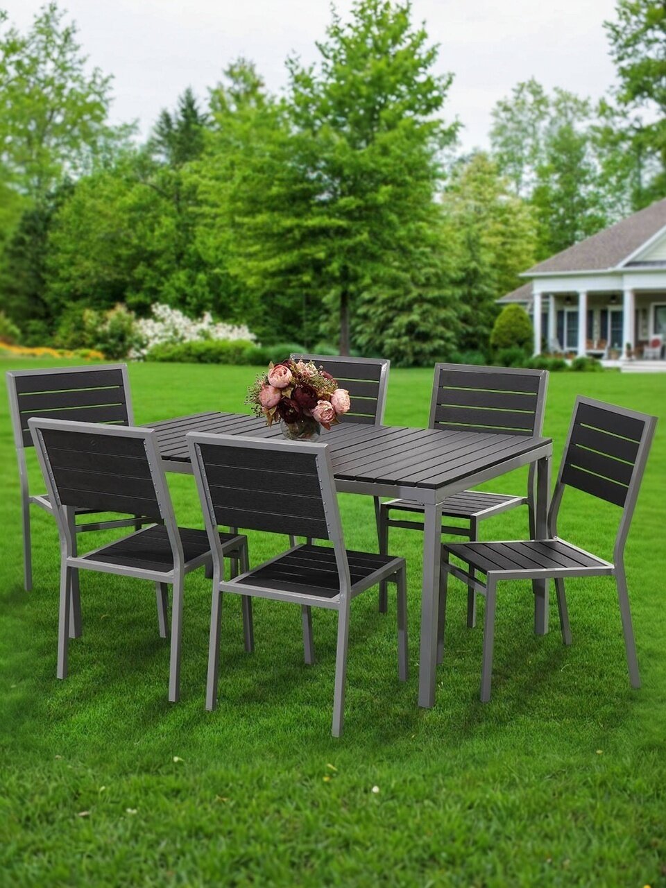 Комплект мебели Эвелина - это воплощение уюта, эта мебель специально создана для загородных домов. Комплект состоит из шести комфортабельных стульев и стола со столешницей из материала Polywood. Эту мебель можно с легкостью отнести к разряду уличной мебели, ведь ее высокая устойчивость к температурным перепадам и атмосферным осадкам позволяет устанавливать ее под открытым небом не боясь потерь в эксплуатационных характеристиках и внешнем виде.