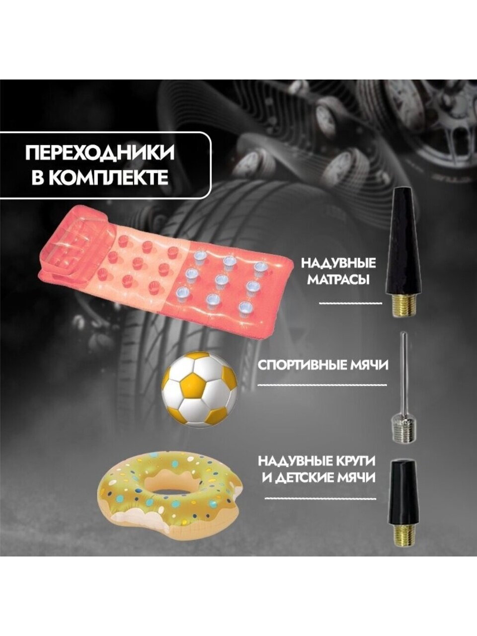Компрессоры автомобильные предназначены для накачки воздухом шин легковых и коммерческих автомобилей. Рабочее напряжение авто компрессоров — 12 Вольт. Высокая производительность автомобильных компрессоров делает возможным более широкое их применение. Автомобильный компрессор может быть использован для накачки воздухом мячей, матрасов, надувных лодок, проведения покрасочных и других подобных работ.