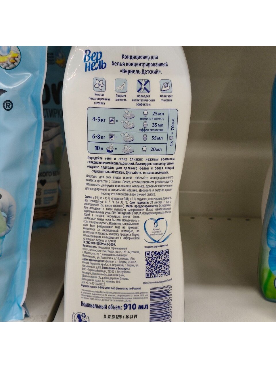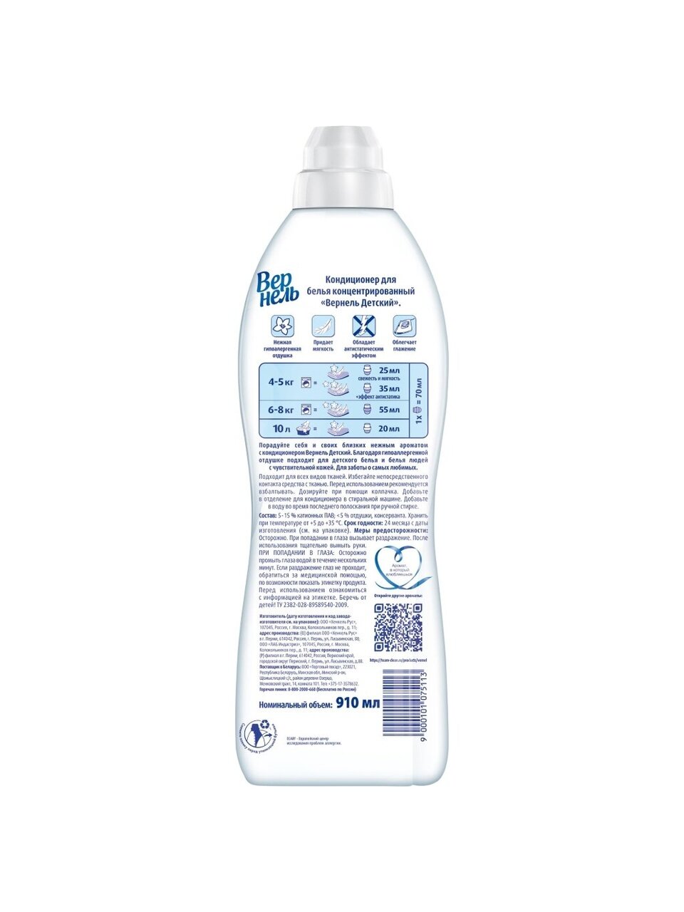Концентрированный кондиционер для белья Вернель Детский 910 мл, 30 стирок предназначен для стирки детского белья, а также одежды людей с чувствительной кожей и склонных к аллергии.